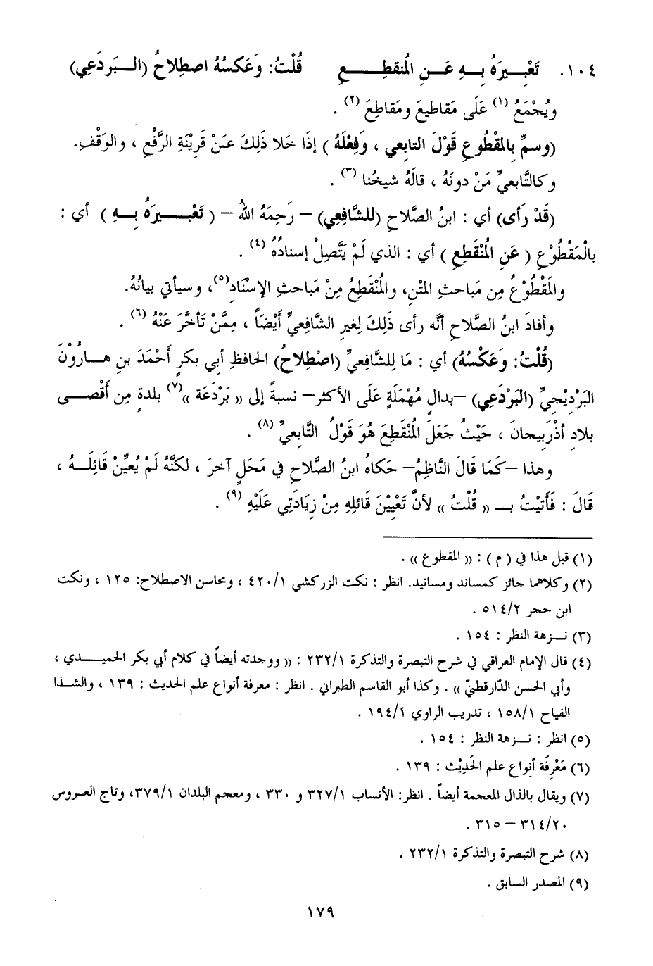 104 - تَعْبِيرَهُ بِهِ عَنِ المُنقطِعِ ... قُلْتُ: وَعَكسُهُ اصطِلاحُ (البَردَعِي)