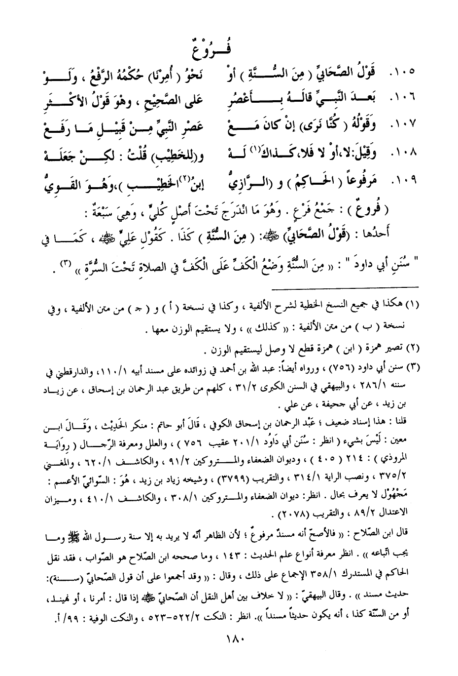 قال ابن الصّلاح: ((فالأصحّ أنه مسندٌ مرفوعٌ؛ لأن الظاهر أنّه لا يريد به إلا سنة رسول الله - صلى الله عليه وسلم - وما يجب اتّباعه)). انظر معرفة أنواع علم الحديث: 143، وما صححه ابن الصّلاح هو الصّواب، فقد نقل الحاكم في المستدرك 1/ 358 الإجماع على ذلك، وقال: ((وقد أجمعوا على أن قول الصّحابيّ (سنة): حديث مسند)). وقال البيهقيّ: ((لا خلاف بين أهل النقل أن الصّحابيّ - رضي الله عنه - إذا قال: أمرنا، أو نهينا، أو من السّنّة كذا، أنه يكون حديثاً مسنداً)). انظر: النكت 2/ 522 - 523، والنكت الوفية: 99/ أ.