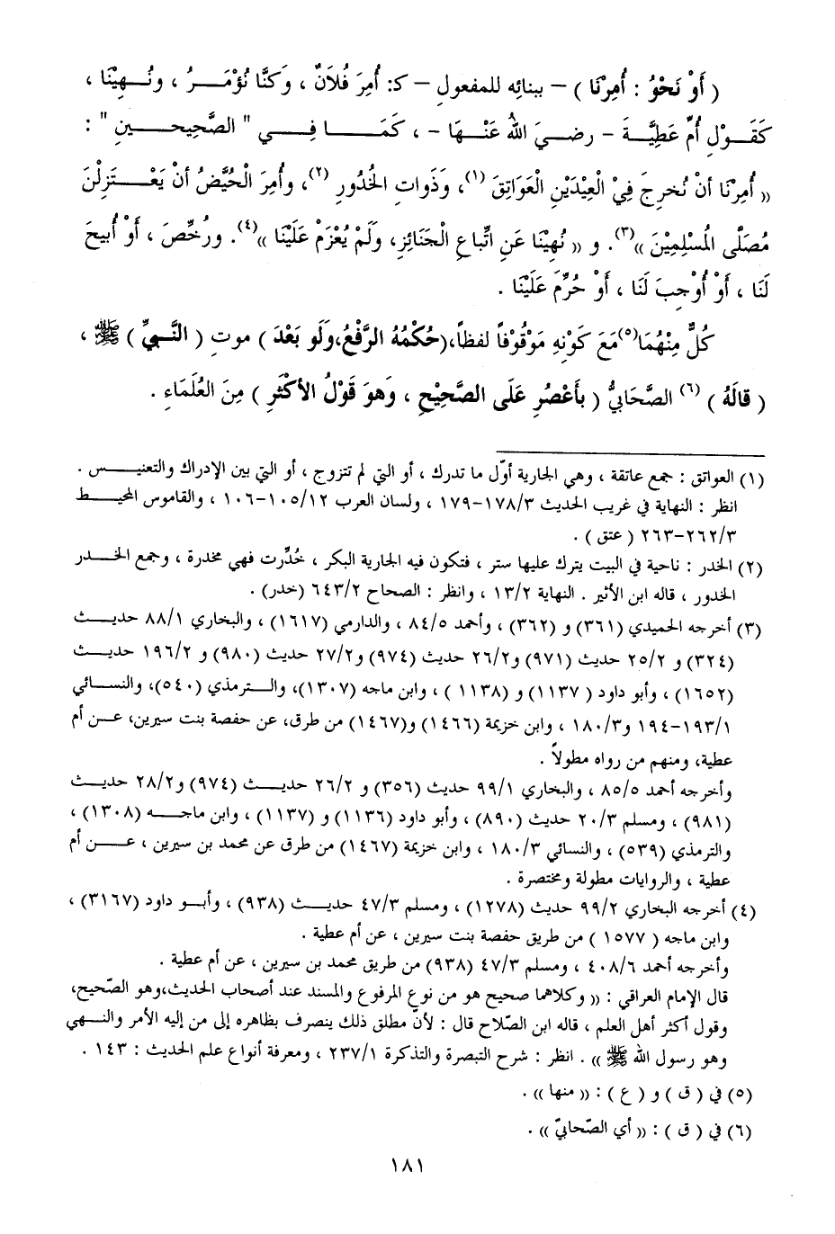 (أَوْ نَحْوُ: أُمِرْنَا) - ببنائِه للمفعولِ - ك: أُمِرَ فُلاَنٌ، وَكنَّا نُؤْمَرُ، ونُهِيْنَا، كَقَوْلِ أُمِّ عَطِيَّةَ - رضيَ اللهُ عَنْهَا -، كَمَا فِي " الصَّحِيحينِ ": ((أُمِرْنَا أنْ نُخرِجَ فِيْ الْعِيْدَيْنِ الْعَوَاتِقَ (¬1)، وَذَواتِ الخُدُورِ (¬2)، وأُمِرَ الْحُيَّضُ أنْ يَعْتَزِلْنَ مُصَلَّى المُسْلِمِيْنَ)) (¬3). و ((نُهِيْنَا عَنِ اتِّباعِ الْجَنَائِزِ، وَلَمْ يُعْزَمْ عَلَيْنَا)) (¬4). ورُخِّصَ، أَوْ أُبيحَ لَنَا، أَوْ أُوْجِبَ لَنَا، أَوْ حُرِّمَ عَلَيْنَا.