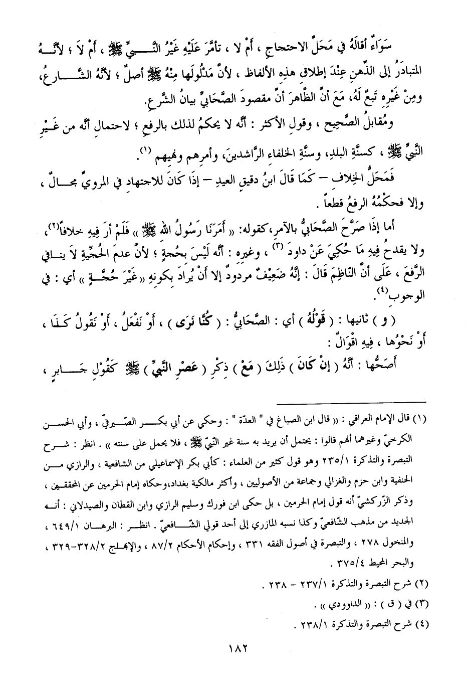 (و) ثانيها: (قَوْلُهُ) أي: الصَّحَابيُّ: (كُنَّا نَرَى)، أَوْ نَفْعَلُ، أَوْ نَقُولُ كَذَا، أَوْ نَحْوُها، فِيهِ اقْوَالٌ:
