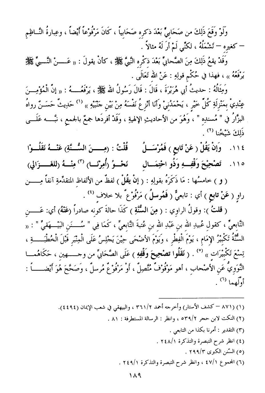 (قلتُ): وقولُ الراوِي: (مِنَ السُّنَّةِ) كَذَا حالةَ كونِه صادراً (عَنْهُ) أي: عَنِ التَّابِعيِّ، كقولِ عُبيدِ اللهِ بنِ عَبْدِ اللهِ بنِ عُتبةَ التَّابِعيِّ، كَمَا فِي " سُنَنِ البَيْهَقيِّ ": ((السُّنَّةُ تَكْبِيْرُ الإِمَامِ، يَوْمَ الْفِطْرِ، وَيَوْمَ الأضْحَى حِيْنَ يَجْلِسُ عَلَى الْمِنْبَرِ قَبْلَ الْخُطْبَةِ، تِسْعَ تَكْبِيْرَاتٍ)) (¬5). (نَقَلُوا تصْحِيحَ وَقْفِهِ) عَلَى الصَّحَابيِّ من وجهينِ، حَكَاهُما النَّوَوِيُّ عَنِ الأصْحابِ، أهو مَوْقُوْفٌ مُتَّصِلٌ، أَوْ مَرْفُوْعٌ مُرسلٌ، وَصَحَّحَ هُوَ أَيْضاً: أوَّلَهما (¬6).