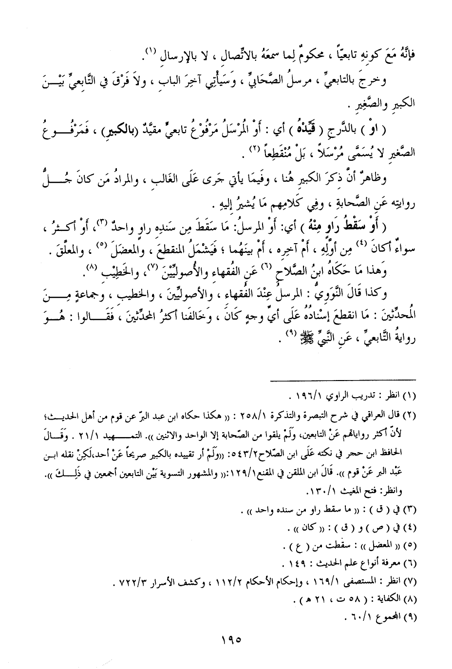 (¬2) قال العراقي في شرح التبصرة والتذكرة 1/ 258: ((هكذا حكاه ابن عبد البرّ عن قوم من أهل الحديث؛ لأنّ أكثر رواياتهم عَنْ التابعين، وَلَمْ يلقوا من الصّحابة إلا الواحد والاثنين)). التمهيد 1/ 21. وَقَالَ الحافظ ابن حجر في نكته عَلَى ابن الصّلاح2/ 543: ((وَلَمْ أر تقييده بالكبير صريحاً عَنْ أحد، لَكِنْ نقله ابن عَبْد البر عَنْ قوم)). قَالَ ابن الملقن في المقنع1/ 129: ((والمشهور التسوية بَيْن التابعين أجمعين في ذَلِكَ)). وانظر: فتح المغيث 1/ 130.