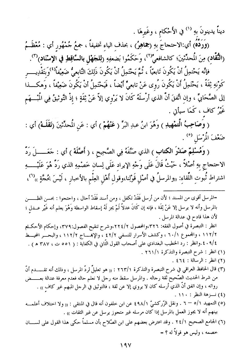 (وَرَدَّهُ) أي: الاحتجاجَ بِهِ (جماهِرُ)، بحذفِ الياءِ تخفيفاً، جمعُ جُمْهُورٍ أي: مُعْظَمُ (النُّقَّادِ) مِنَ المُحدِّثينَ؛ كالشافعيِّ (¬2)، وَحَكَمُوا بَضعفِهِ (لِلجَهْلِ بالسَّاقِطِ في الإسْنَادِ) (¬3).