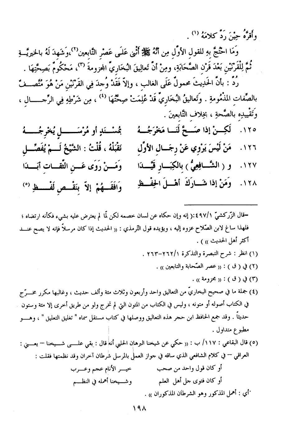 127 - و (الشَّافِعِيُّ) بِالكِبَارِ قَيَّدَا ... وَمَنْ رَوَى عَنِ الثِّقاتِ أبَدَا