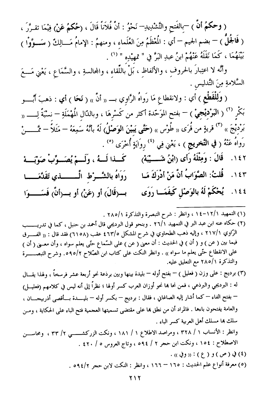 (وَلِلْقَطْعِ) أي: ولانقطاعِ مَا رَواهُ الرَّاوِي بـ ((أنَّ)) (نَحَا) أي: ذهبَ أَبُو بَكْرٍ (¬2) (البَرْدِيْجِيْ) - بفتح الموَحّدة أكثر من كَسْرِهَا، وبالدّالِ المُهْمَلَةِ - نِسْبَةً لِـ ((بَرْدِيْجَ)) (¬3) قريةٍ من قُرَى ((طُوْس)) (حَتَّى يَبِيْنَ الوَصْلُ) لَهُ بأنَّهُ سَمِعَهُ - مَثَلاً - ممَّنْ رَواهُ عَنْهُ (في التَّخريجِ)، يَعْني فِي (¬4) رِوَايَةٍ أُخْرَى (¬5).