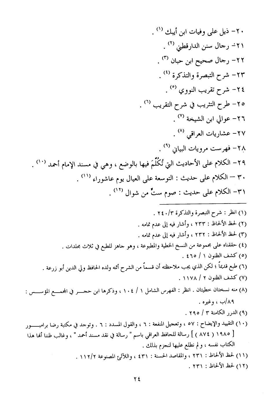 [1985 (874)] رسالة للحافظ العراقي باسم " رسالة في نقد مسند أحمد "، وغالب ظننا أنها هذا الكتاب نفسه، ولم نطلع عليها لنجزم بذلك.