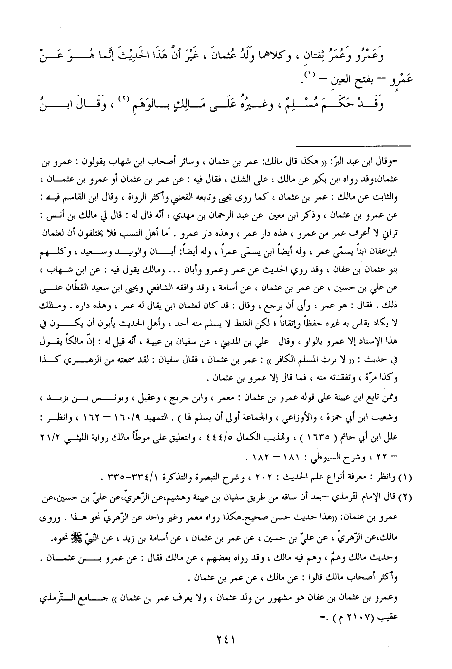 = وقال ابن عبد البر: ((هكذا قال مالك: عمر بن عثمان، وسائر أصحاب ابن شهاب يقولون: عمرو بن عثمان، وقد رواه ابن بكير عن مالك، على الشك، فقال فيه: عن عمر بن عثمان أو عمرو بن عثمان، والثابت عن مالك: عمر بن عثمان، كما روى يحيى وتابعه وأكثر الرواة، وقال ابن القاسم فيه: عن عمرو بن عثمان، وذكر ابن معين عن عبد الرحمن بن مهدي، أنه قال له: قال لي مالك بن أنس: تراني لا أعرف عمر من عمرو، هذه دار عمر، وهذه دار عمرو. أما أهل النسب فلا يختلفون أن لعثمان ابن عفان ابنا يسمى عمر، وله أيضا ابن يسمى عمرا، وله أيضا: أبان والوليد وسعيد، وكلهم بنو عثمان بن عفان، وقد روي الحديث عن عمر وعمرو وأبان ... ومالك يقول فيه: عن ابن شهاب، عن علي بن حسين، عن عمر بن عثمان، عن أسامة، وقد وافقه الشافعي ويحيى ابن سعيد القطان على ذلك، فقال: هو عمر، وأبى أن يرجع، وقال: قد كان لعثمان ابن يقال له عمر، وهذه داره. ومالك لا يكاد يقاس به غيره حفظا وإتقانا؛ لكن الغلط لا يسلم منه أحد، وأهل الحديث يأبون أن يكون في هذا الإسناد إلا عمرو بالواو، وقال علي بن المديني، عن سفيان بن عيينة، أنه قيل له: إن مالكا يقول في حديث: ((لا يرث المسلم الكافر)): عمر بن عثمان، فقال سفيان: لقد سمعته من الزهري كذا وكذا مرة، وتفقدته منه، فما قال إلا عمرو بن عثمان.