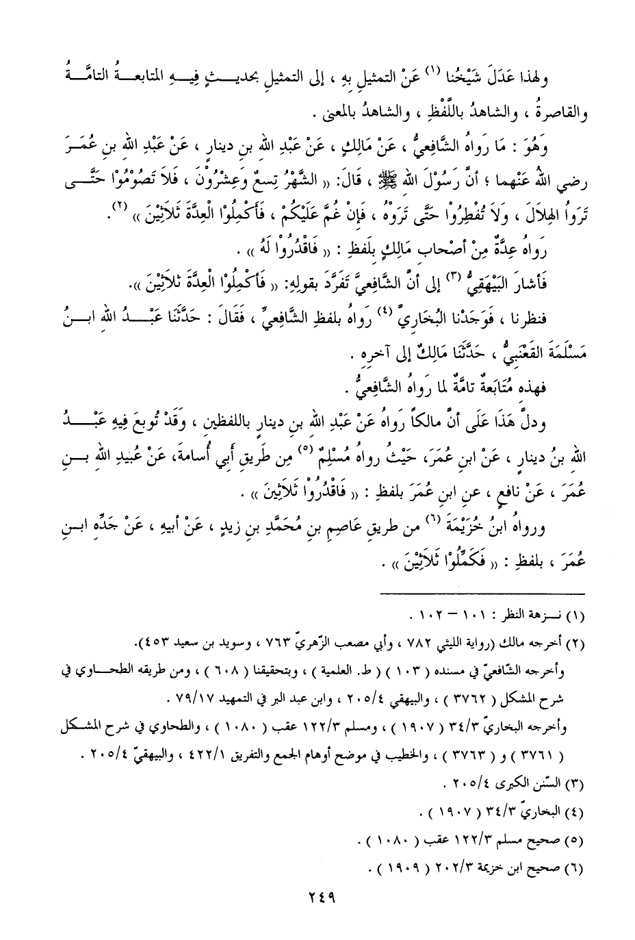 وَهُوَ: مَا رَواهُ الشَّافِعيُّ، عَنْ مَالِكٍ، عَنْ عَبْدِ اللهِ بنِ دينارٍ، عَنْ عَبْدِ اللهِ بنِ عُمَرَ رضي اللهُ عَنْهما؛ أنَّ رَسُوْلَ اللهِ - صلى الله عليه وسلم -، قَالَ: ((الشَّهْرُ تِسعٌ وَعِشْرُوْنَ، فَلاَ تَصُوْمُوْا حَتَّى تَرَواُ الهِلاَلَ، وَلاَ تُفْطِرُوْا حَتَّى تَرَوْهُ، فَإِنْ غُمَّ عَلَيْكُمْ، فَأَكْمِلُوْا الْعِدَّةَ ثَلاَثِيْنَ)) (¬2).