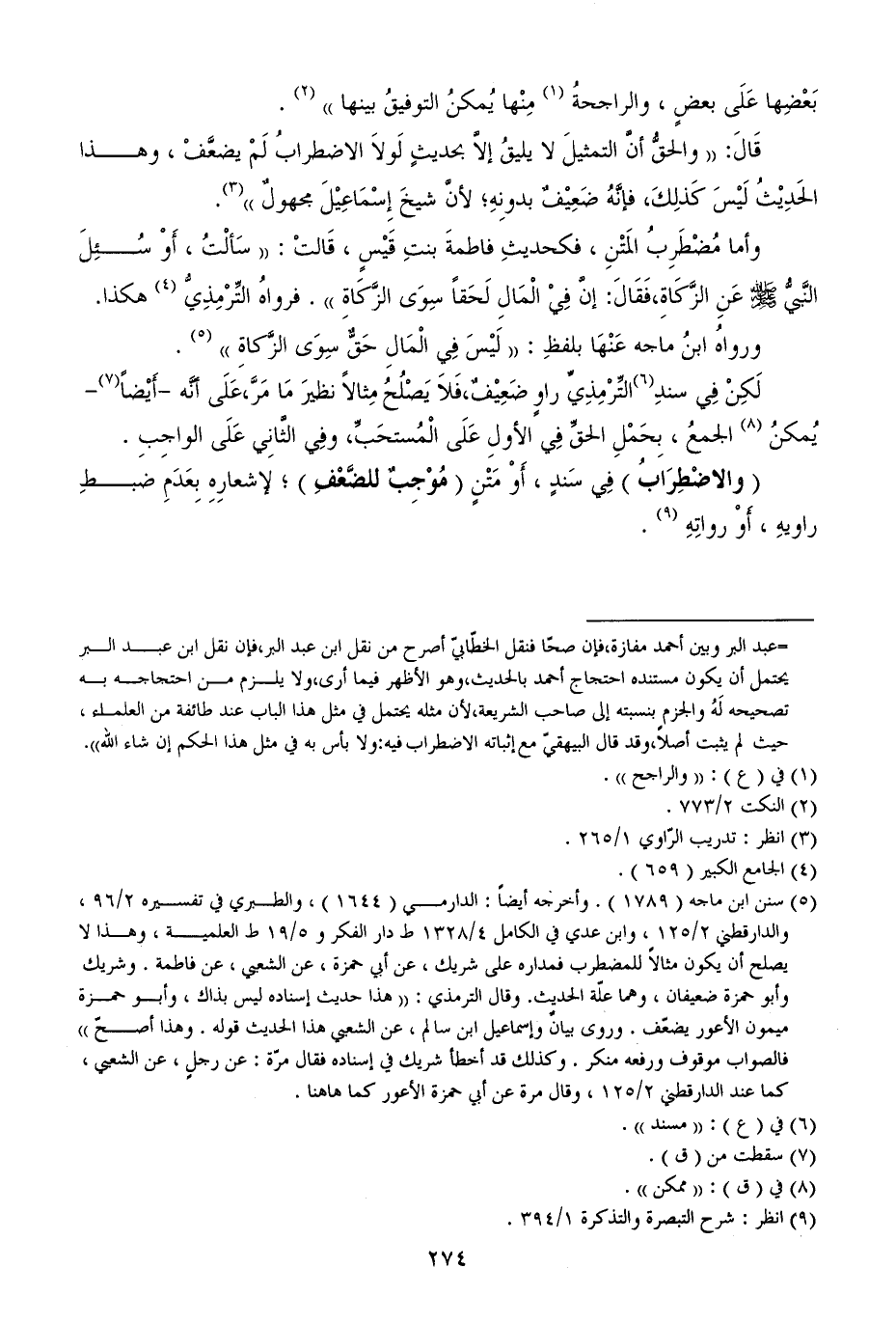 (¬5) سنن ابن ماجه (1789). وأخرجه أيضاً: الدارمي (1644)، والطبري في تفسيره 2/ 96، والدارقطني 2/ 125، وابن عدي في الكامل 4/ 1328 ط دار الفكر و 5/ 19 ط العلمية، وهذا لا يصلح أن يكون مثالاً للمضطرب فمداره على شريك، عن أبي حمزة، عن الشعبي، عن فاطمة. وشريك وأبو حمزة ضعيفان، وهما علّة الحديث. وقال الترمذي: ((هذا حديث إسناده ليس بذاك، وأبو حمزة ميمون الأعور يضعّف. وروى بيانٌ وإسماعيل ابن سالم، عن الشعبي هذا الحديث قوله. وهذا أصحّ)) فالصواب موقوف ورفعه منكر. وكذلك قد أخطأ شريك في إسناده فقال مرّة: عن رجلٍ، عن الشعبي، كما عند الدارقطني 2/ 125، وقال مرة عن أبي حمزة الأعور كما هاهنا.