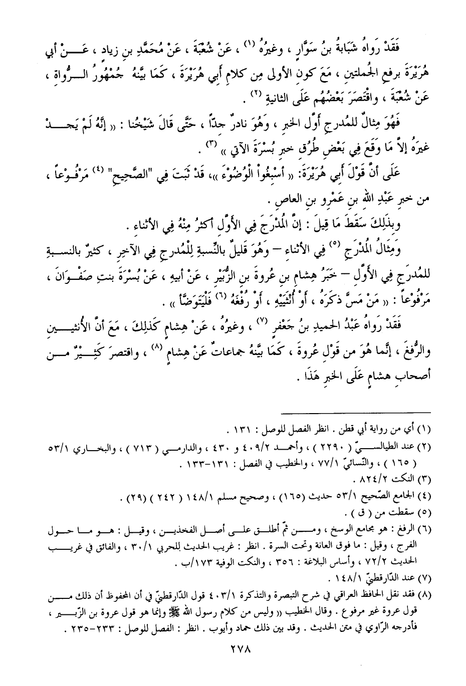 (¬8) فقد نقل الحافظ العراقي في شرح التبصرة والتذكرة 1/ 403 قول الدّارقطنيّ في أن المحفوظ أن ذلك من قول عروة غير مرفوع. وقال الخطيب ((وليس من كلام رسول الله - صلى الله عليه وسلم - وإنما هو قول عروة بن الزّبير، فأدرجه الرّاوي في متن الحديث. وقد بين ذلك حماد وأيوب. انظر: الفصل للوصل: 233 - 235.