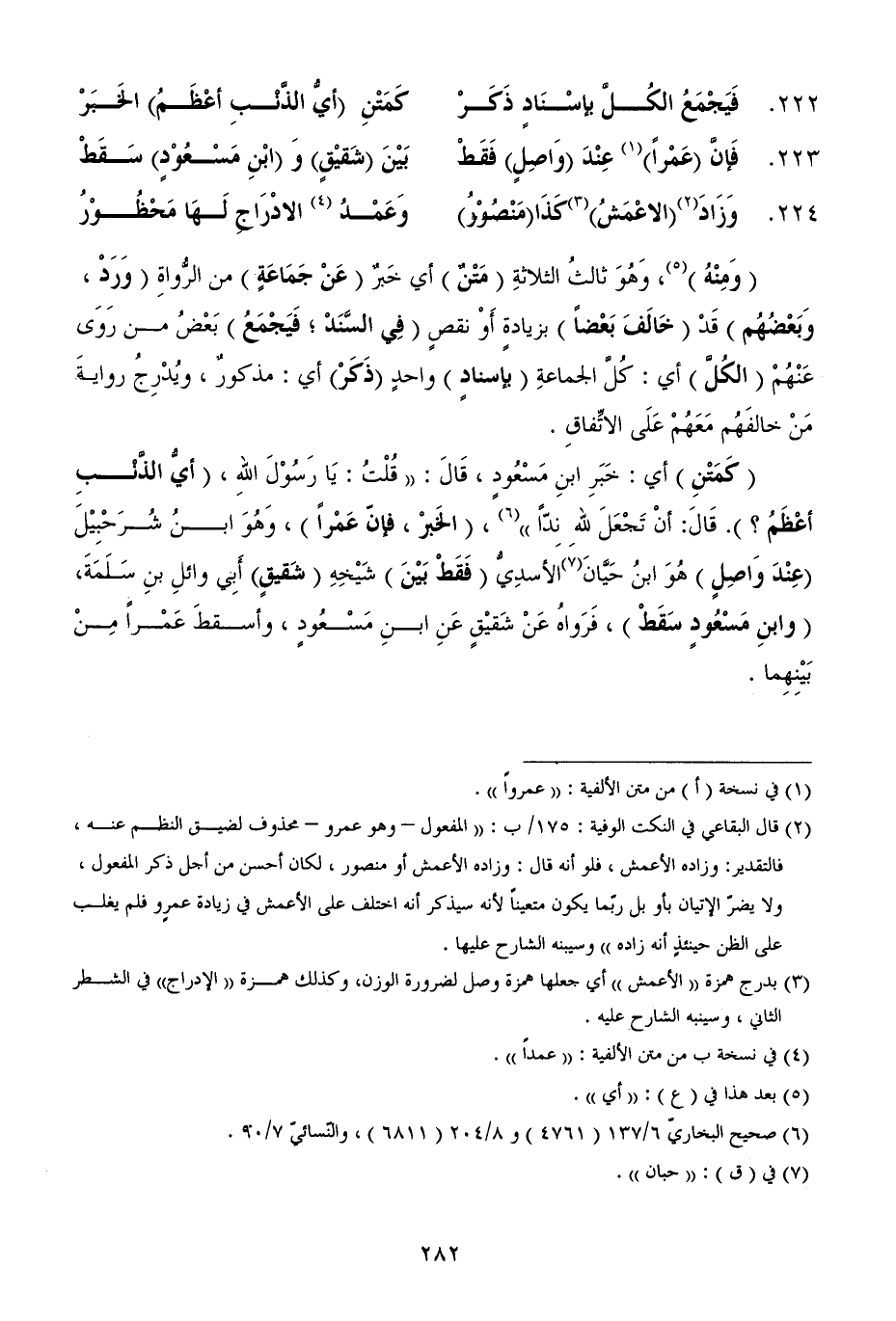 (¬2) قال البقاعي في النكت الوفية: 175/ ب: ((المفعول - وهو عمرو - محذوف لضيق النظم عنه، فالتقدير: وزاده الأعمش، فلو أنه قال: وزاده الأعمش أو منصور، لكان أحسن من أجل ذكر المفعول، ولا يضرّ الإتيان بأو بل ربّما يكون متعيناً لأنه سيذكر أنه اختلف على الأعمش في زيادة عمرٍو فلم يغلب على الظن حينئذٍ أنه زاده)) وسيبنه الشارح عليها.