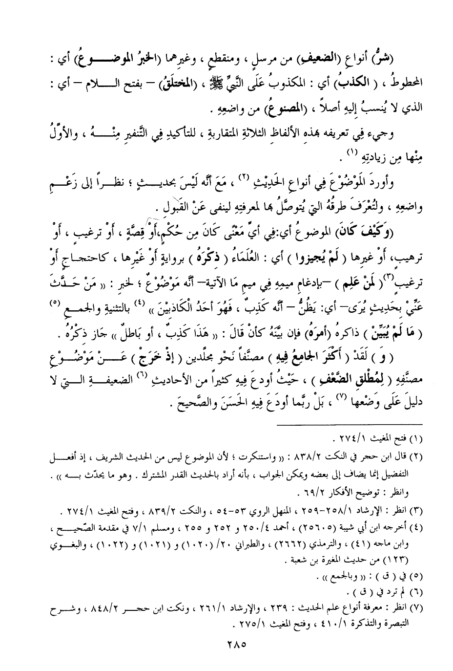 (¬7) انظر: معرفة أنواع علم الحديث: 239، والإرشاد 1/ 261، ونكت ابن حجر 2/ 848، وشرح التبصرة والتذكرة 1/ 410، وفتح المغيث 1/ 275.