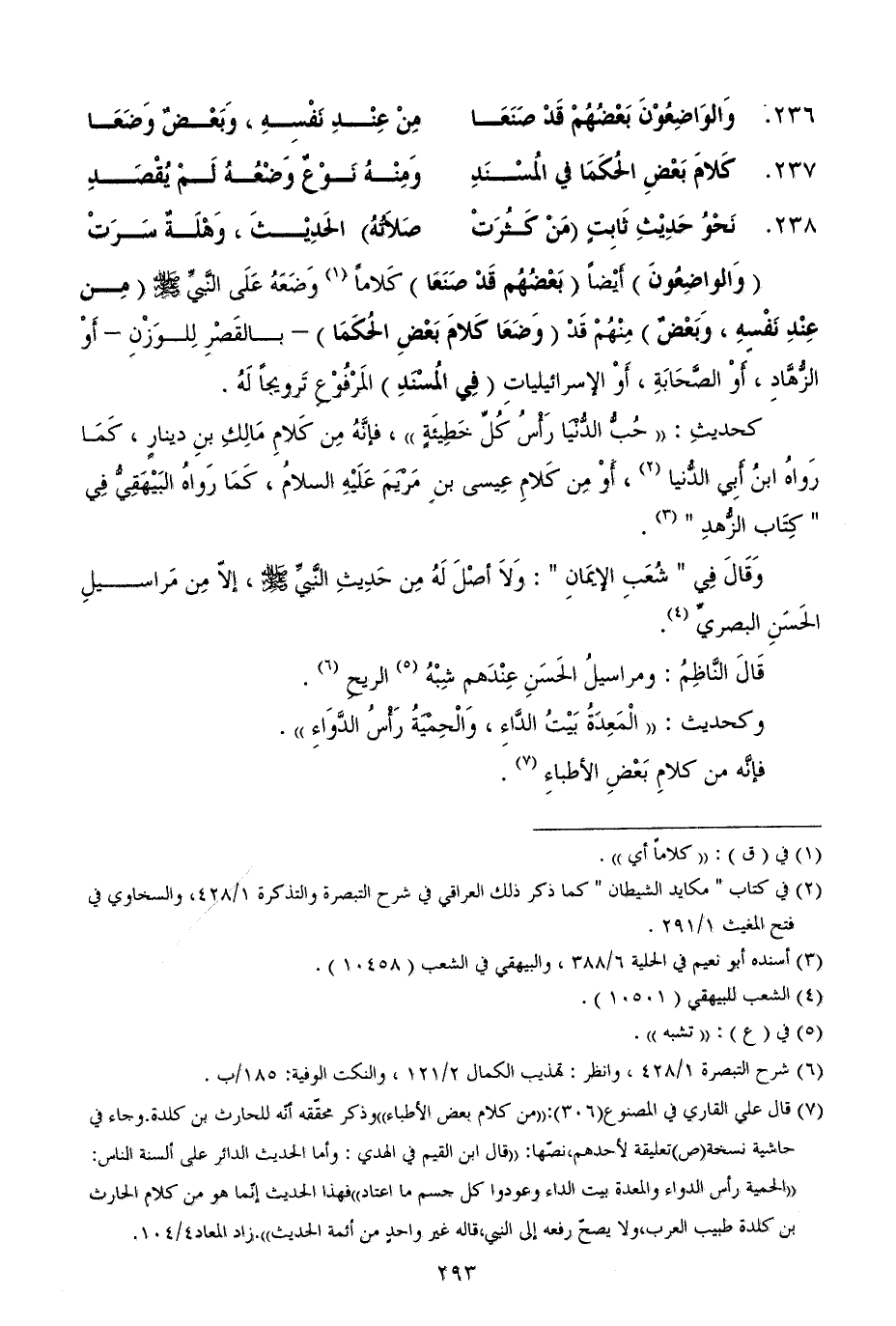 (¬7) قال علي القاري في المصنوع (306): ((من كلام بعض الأطباء)) وذكر محقّقه أنّه للحارث بن كلدة. وجاء في حاشية نسخة (ص) تعليقة لأحدهم، نصّها: ((قال ابن القيم في الهدي: وأما الحديث الدائر على ألسنة الناس: ((الحمية رأس الدواء والمعدة بيت الداء وعودوا كل جسم ما اعتاد)) فهذا الحديث إنّما هو من كلام الحارث بن كلدة طبيب العرب، ولا يصحّ رفعه إلى النبي، قاله غير واحدٍ من أئمة الحديث)). زاد المعاد4/ 104.