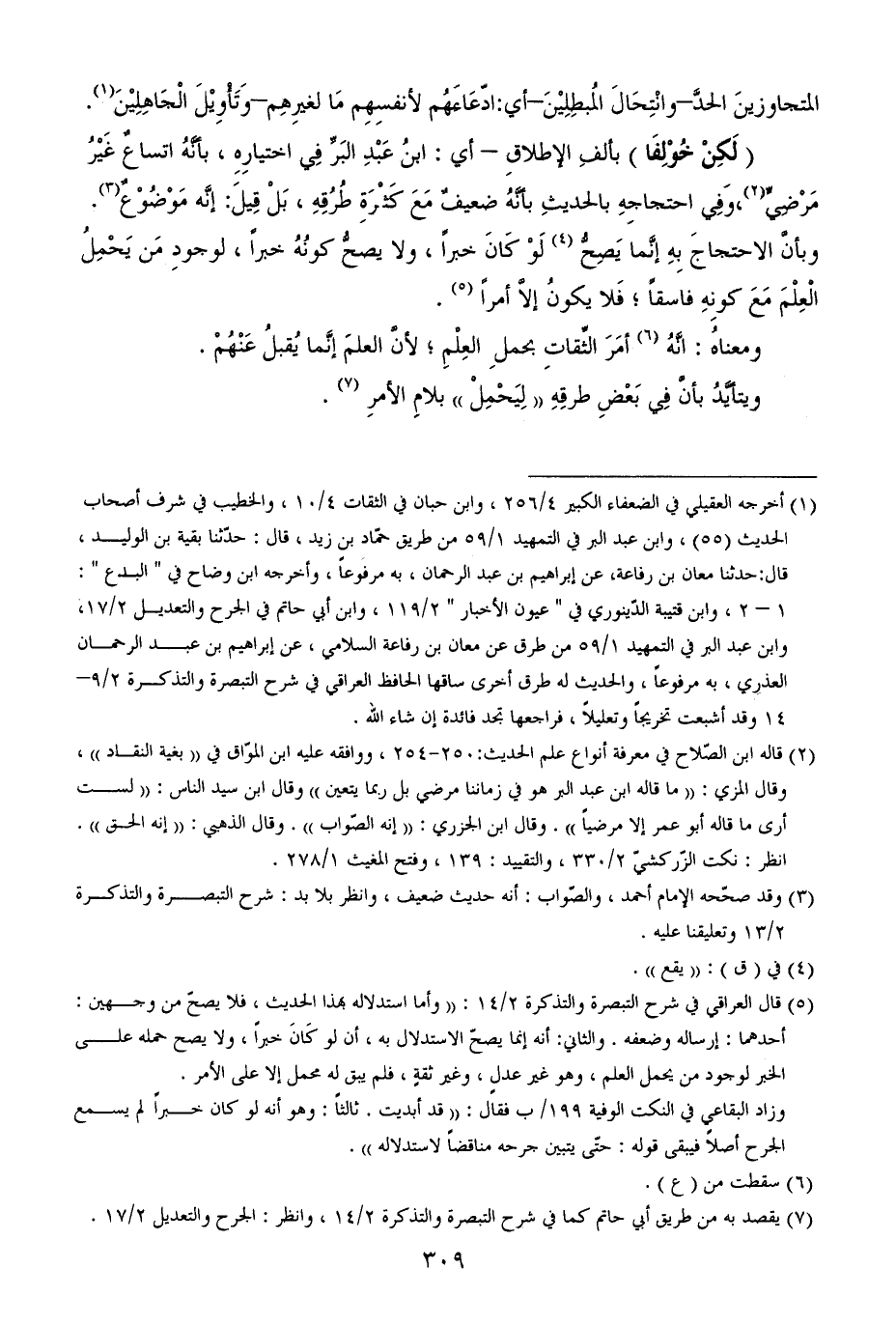 (¬1) أخرجه العقيلي في الضعفاء الكبير 4/ 256، وابن حبان في الثقات 4/ 10، والخطيب في شرف أصحاب الحديث (55)، وابن عبد البر في التمهيد 1/ 59 من طريق حمّاد بن زيد، قال: حدّثنا بقية بن الوليد، قال: حدثنا معان بن رفاعة، عن إبراهيم بن عبد الرحمان، به مرفوعاً، وأخرجه ابن وضاح في " البدع ": 1 - 2، وابن قتيبة الدّينوري في " عيون الأخبار " 2/ 119، وابن أبي حاتم في الجرح والتعديل 2/ 17، وابن عبد البر في التمهيد 1/ 59 من طرق عن معان بن رفاعة السلامي، عن إبراهيم بن عبد الرحمان العذري، به مرفوعاً، والحديث له طرق أخرى ساقها الحافظ العراقي في شرح التبصرة والتذكرة 2/ 9 - 14 وقد أشبعت تخريجاً وتعليلاً، فراجعها تجد فائدة إن شاء الله.