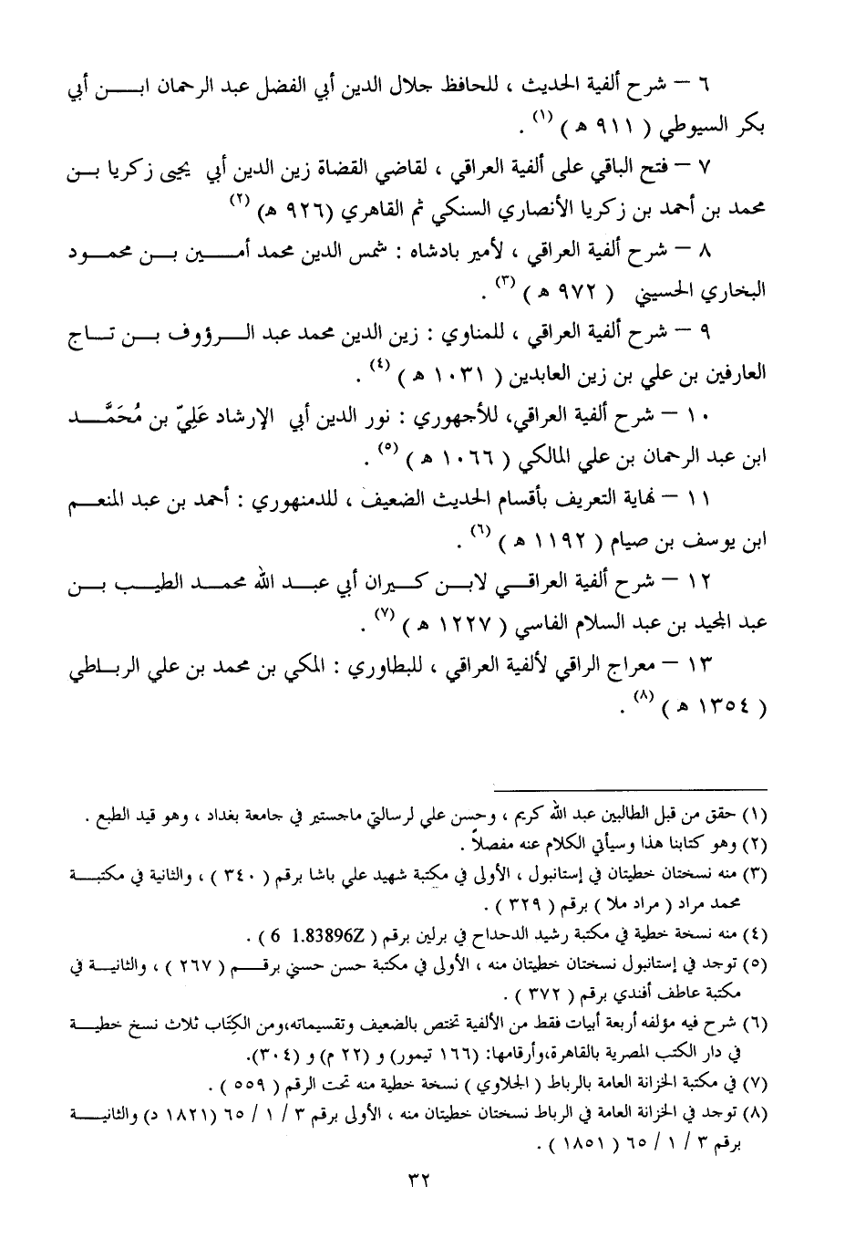 (¬6) شرح فيه مؤلفه أربعة أبيات فقط من الألفية تختص بالضعيف وتقسيماته، ومن الكِتَاب ثلاث نسخ خطية في دار الكتب المصرية بالقاهرة، وأرقامها: (166 تيمور) و (22 م) و (304).