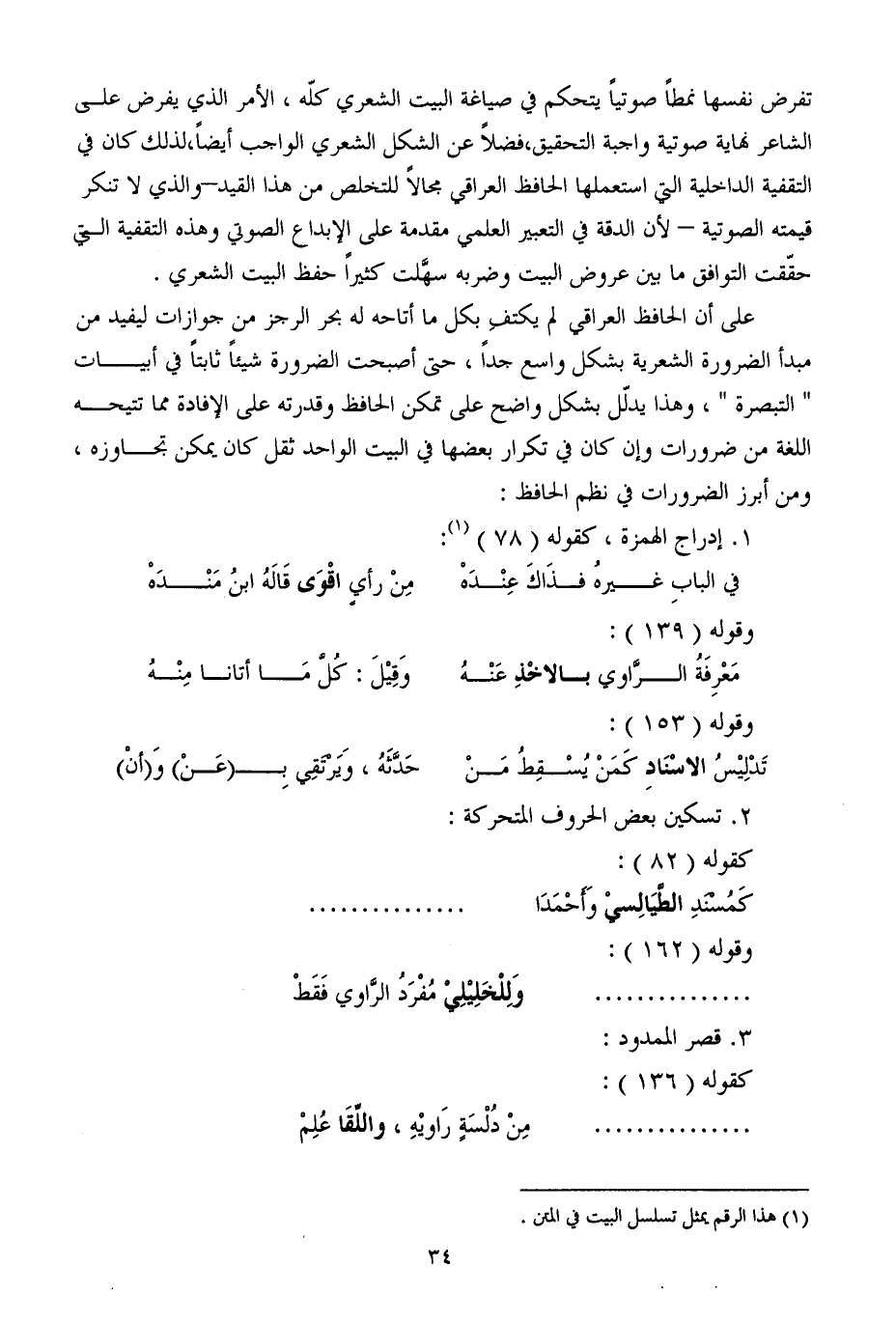 " التبصرة "، وهذا يدلّل بشكل واضح على تمكن الحافظ وقدرته على الإفادة مما تتيحه اللغة من ضرورات وإن كان في تكرار بعضها في البيت الواحد ثقل كان يمكن تجاوزه، ومن أبرز الضرورات في نظم الحافظ: