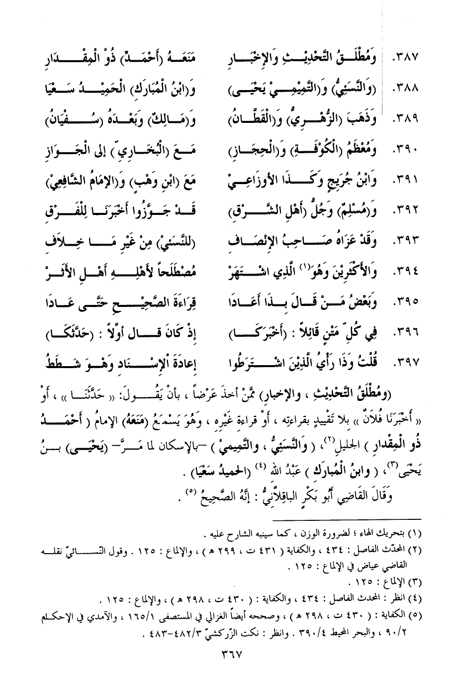 387 - وَمُطْلَقُ التَّحْدِيْثِ وَالإِخْبَارِ ... مَنَعَهُ (أَحْمَدُ) ذُوْ الْمِقْدَارِ