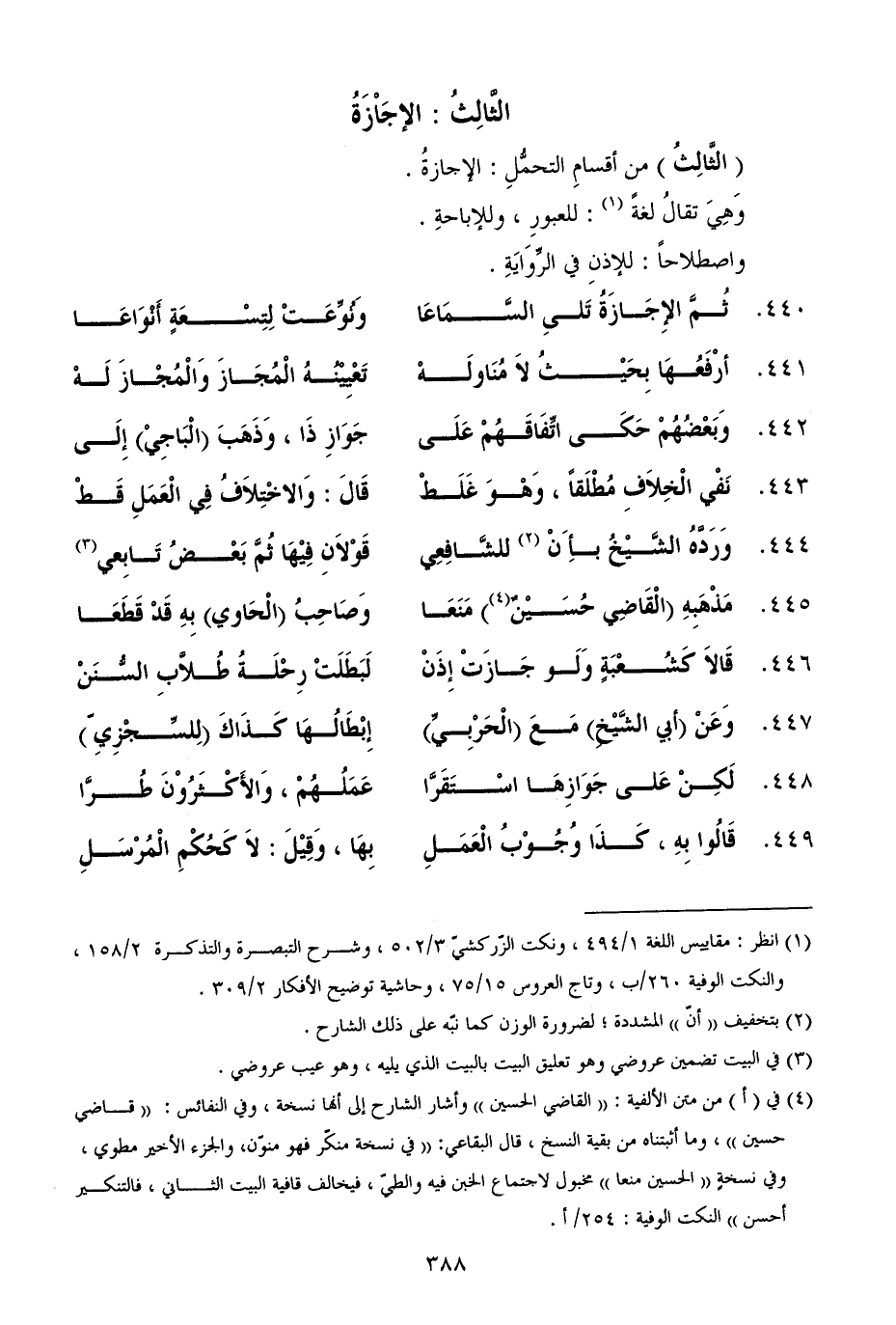 440 - ثُمَّ الإِجَازَةُ تَلىِ السَّمَاعَا ... وَنُوِّعَتْ لِتِسْعَةٍ أَنْوَاعَا