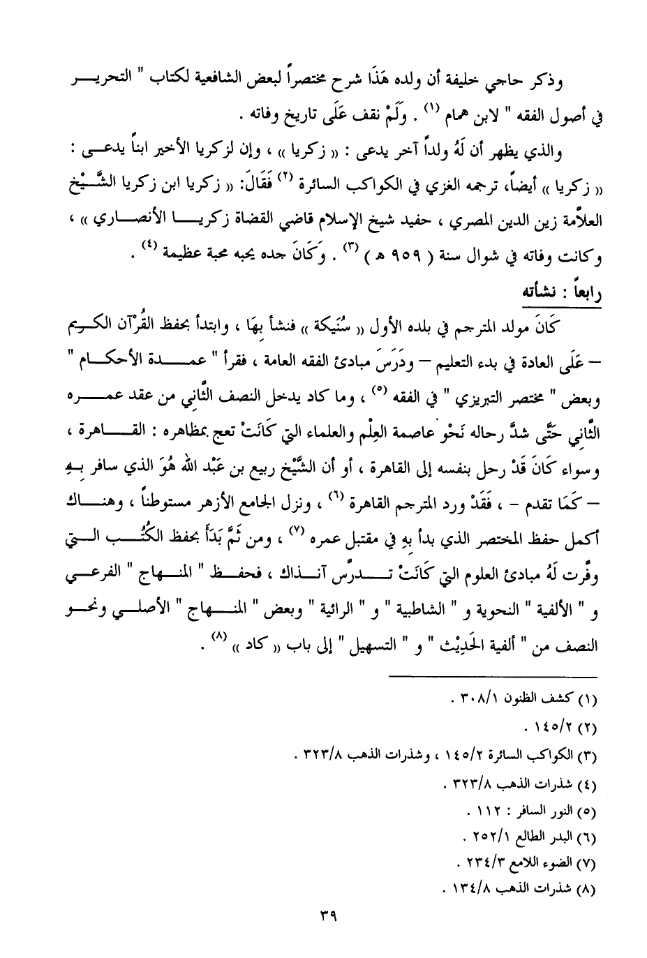 ((زكريا)) أيضاً، ترجمه الغزي في الكواكب السائرة (¬2) فَقَالَ: ((زكريا ابن زكريا الشَّيْخ العلاَّمة زين الدين المصري، حفيد شيخ الإسلام قاضي القضاة زكريا الأنصاري))، وكانت وفاته في شوال سنة (959 هـ) (¬3). وَكَانَ جده يحبه محبة عظيمة (¬4).