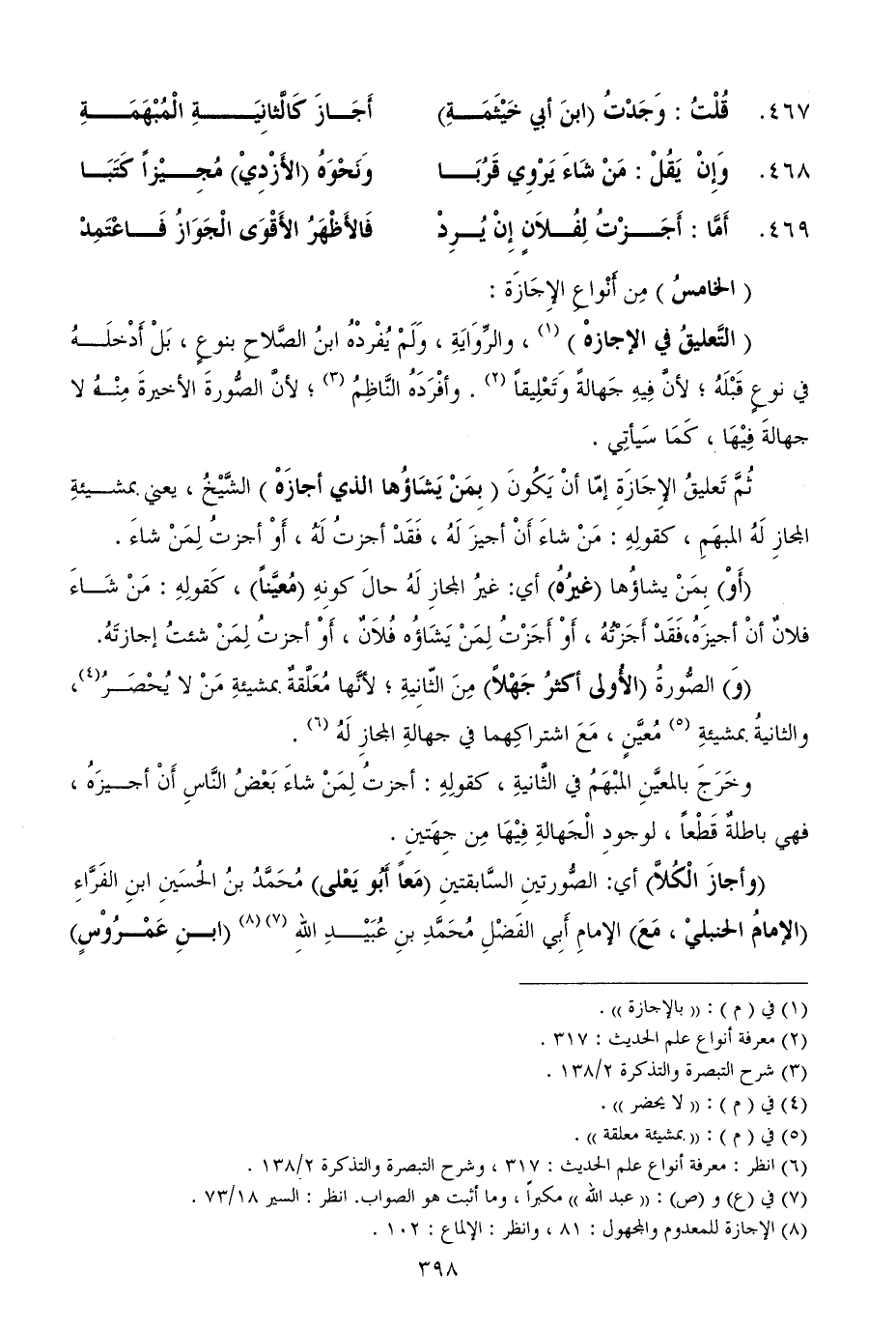 467 - قُلْتُ: وَجَدْتُ (ابنَ أبي خَيْثَمَةِ) ... أَجَازَ كَالَّثانِيَةِ الْمُبْهَمَةِ
