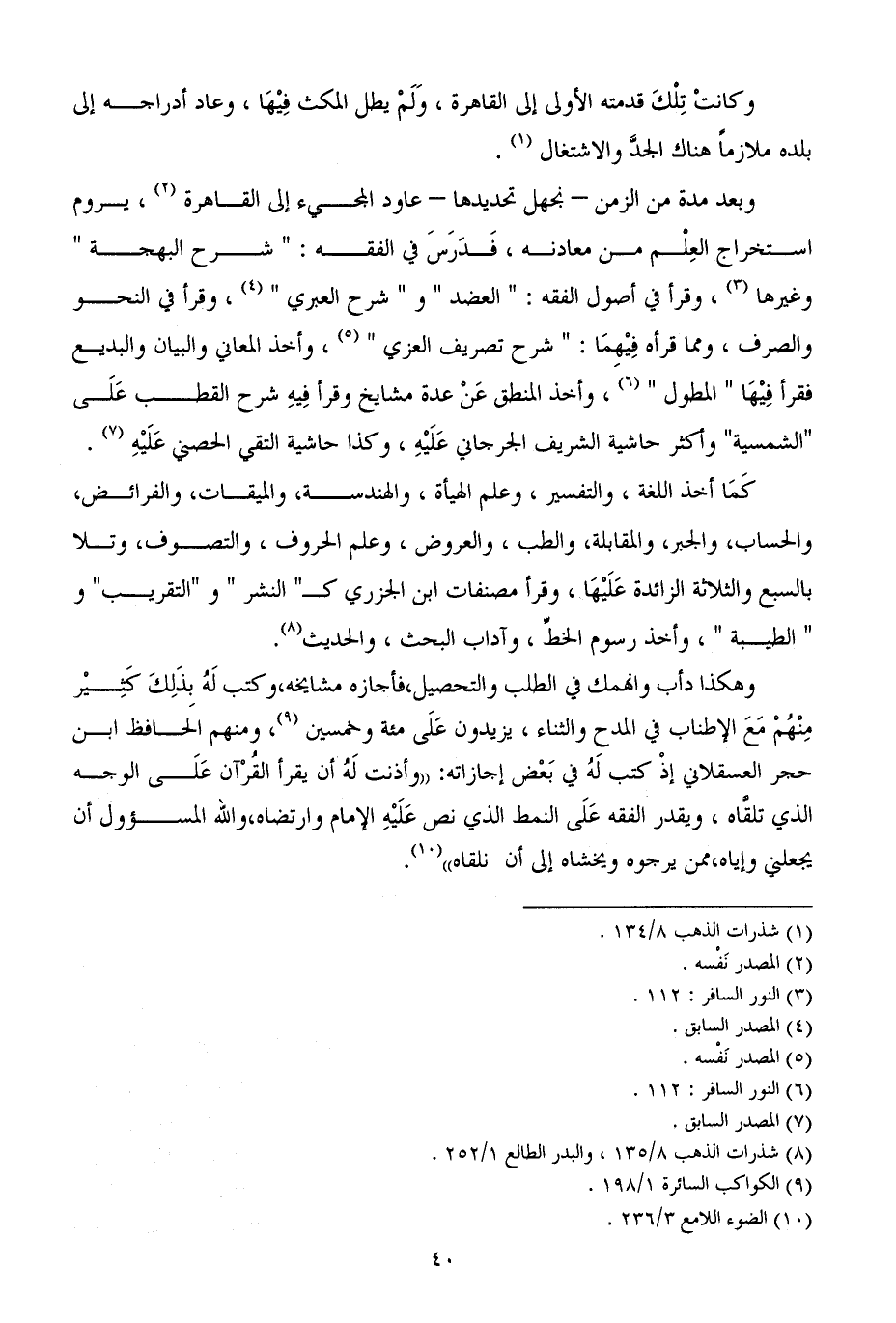 وكانتْ تِلْكَ قدمته الأولى إلى القاهرة، وَلَمْ يطل المكث فِيْهَا، وعاد أدراجه إلى بلده ملازماً هناك الجدَّ والاشتغال (¬1).