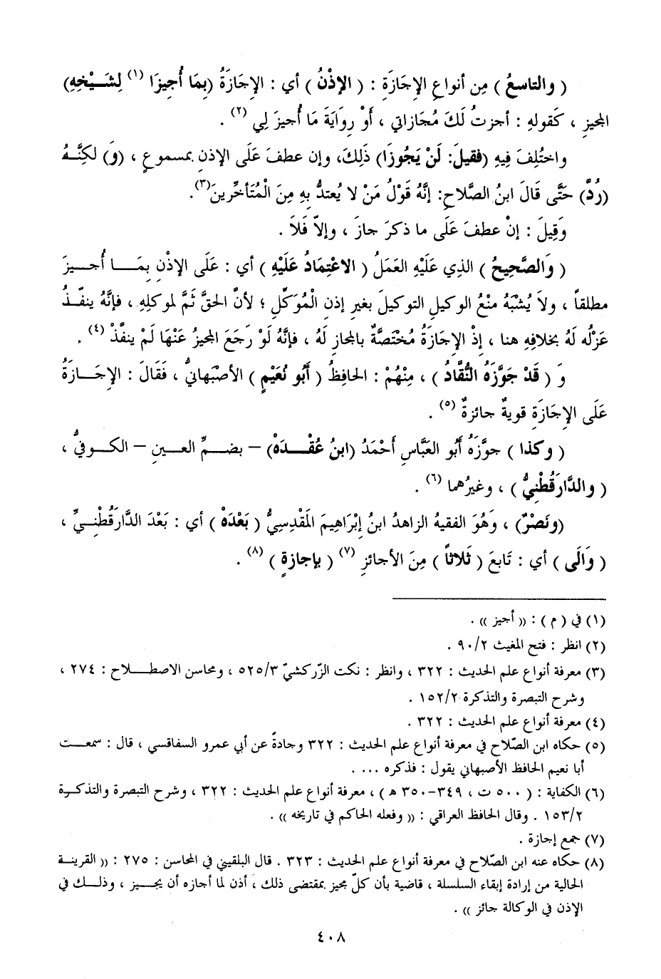 (¬8) حكاه عنه ابن الصّلاح في معرفة أنواع علم الحديث: 323. قال البلقيني في المحاسن: 275: ((القرينة الحالية من إرادة إبقاء السلسلة، قاضية بأن كلّ مجيز بمقتضى ذلك، أذن لما أجازه أن يجيز، وذلك في الإذن في الوكالة جائز)).