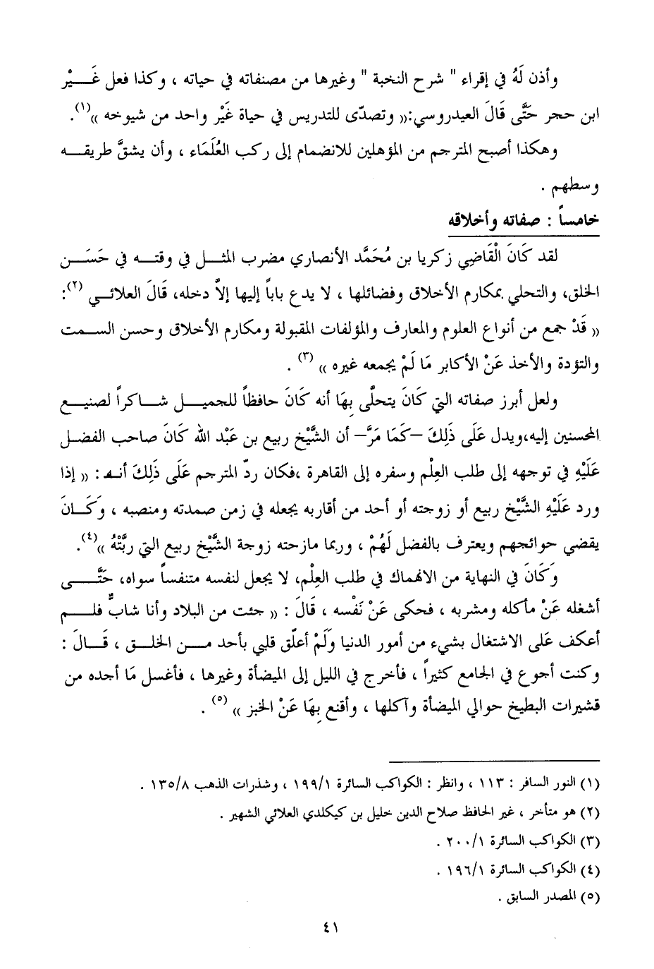 لقد كَانَ الْقَاضِي زكريا بن مُحَمَّد الأنصاري مضرب المثل في وقته في حَسَن الخلق، والتحلي بمكارم الأخلاق وفضائلها، لا يدع باباً إليها إلاَّ دخله، قَالَ العلائي (¬2): ((قَدْ جمع من أنواع العلوم والمعارف والمؤلفات المقبولة ومكارم الأخلاق وحسن السمت والتؤدة والأخذ عَنْ الأكابر مَا لَمْ يجمعه غيره)) (¬3).