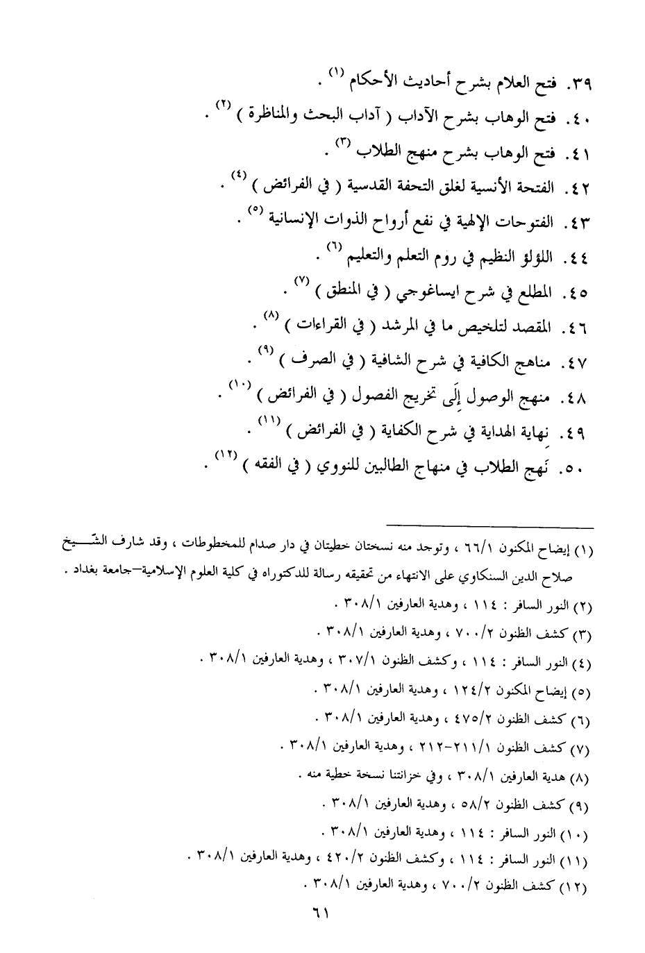 (¬11) النور السافر: 114، وكشف الظنون 2/ 420، وهدية العارفين 1/ 308.