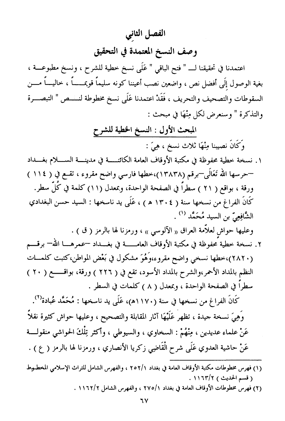 اعتمدنا في تحقيقنا لـ " فتح الباقي " عَلَى نسخ خطية للشرح، ونسخ مطبوعة، بغية الوصول إِلَى أفضل نص، واضعين نصب أعيننا كونه سليماً قويماً، خالياً من السقوطات والتصحيف والتحريف، فَقَدْ اعتمدنا عَلَى نسخ مخطوطة لنص " التبصرة والتذكرة " وسنعرض لكل مِنْهَا في مبحث: