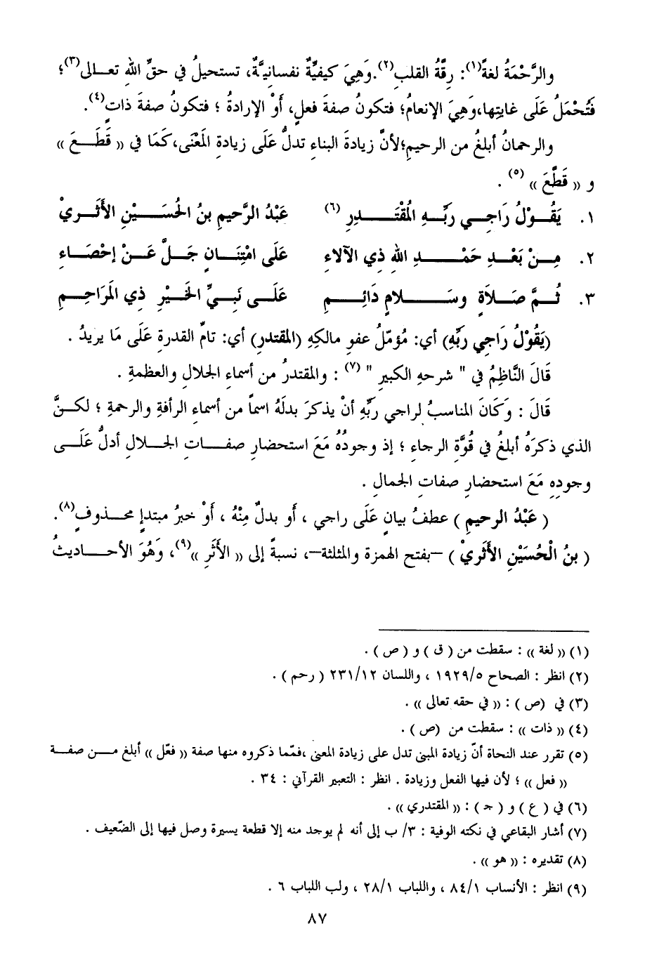 (عَبْدُ الرحيمِ) عطفُ بيانٍ عَلَى راجي، أَو بدلٌ مِنْهُ، أَوْ خبرُ مبتدإٍ محذوفٍ (¬8). (بنُ الْحُسَيْنِ الأَثَريْ) -بفتح الهمزة والمثلثة-، نسبةً إلى ((الأَثَرِ)) (¬9)، وَهُوَ الأحاديثُ