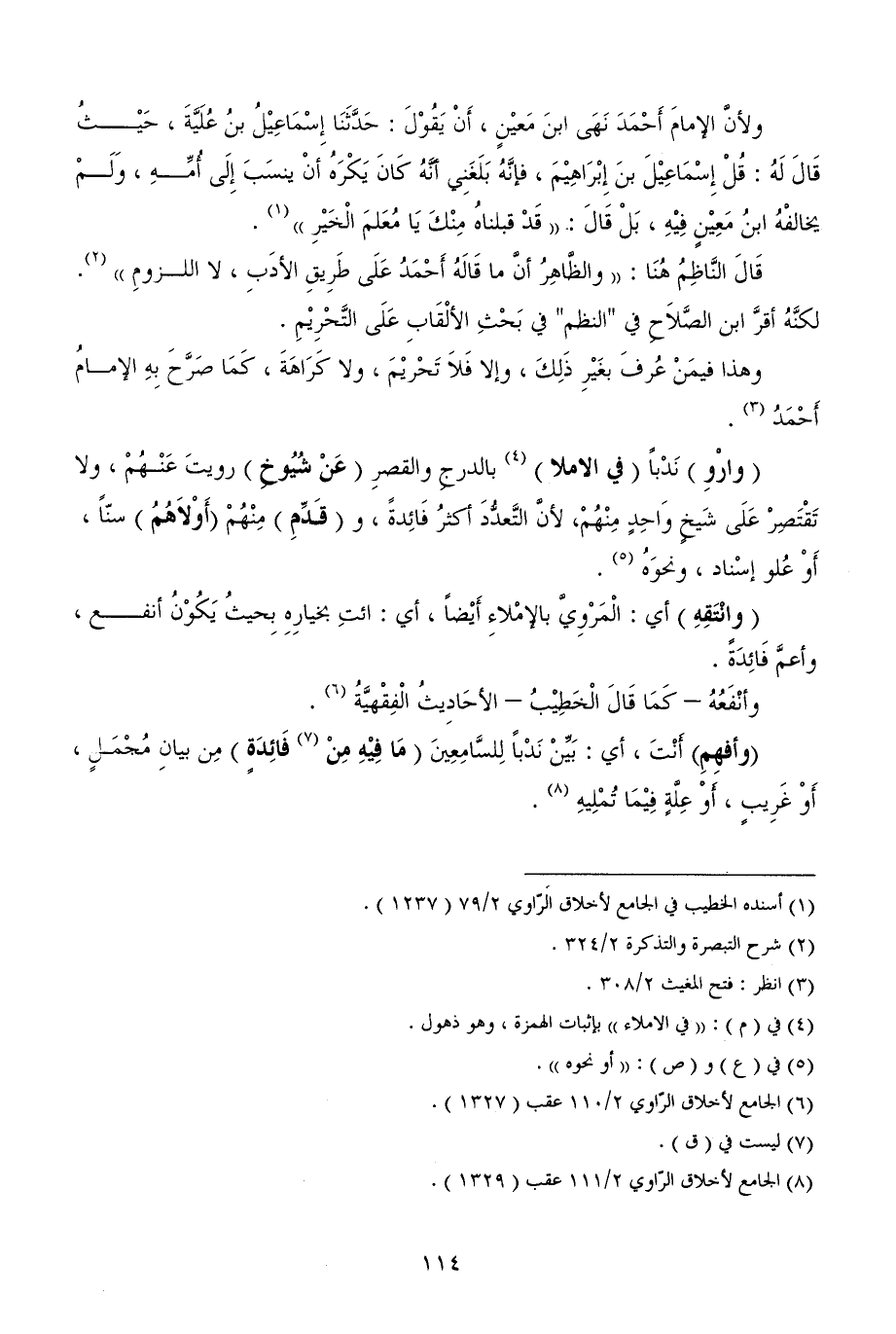 قَالَ النَّاظِمُ هُنَا: ((والظَّاهِرُ أنَّ ما قَالَهُ أَحْمَدُ عَلَى طَرِيقِ الأدَبِ، لا اللزومِ)) (¬2). لكنَّهُ أقرَّ ابن الصَّلاَحِ في "النظم" في بَحْثِ الألْقَابِ عَلَى التَّحْرِيْمِ.