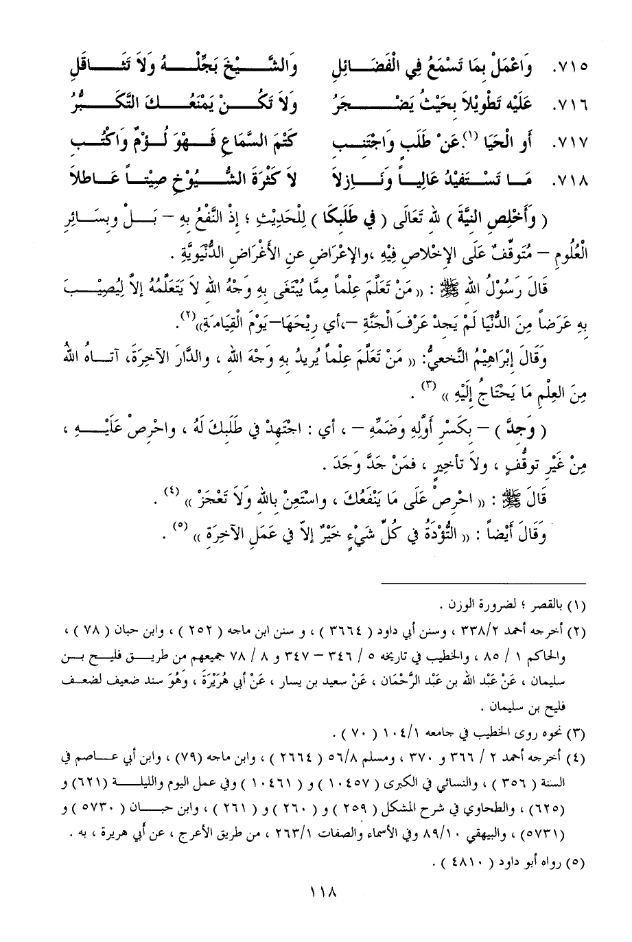 (وَأَخْلِصِ النِيَّةَ) للهِ تَعَالَى (في طَلَبِكَا) لِلْحَدِيْثِ؛ إِذْ النَّفْعُ بِهِ - بَلْ وبِسَائِرِ الْعُلُومِ - مُتَوقِّفٌ عَلَى الإِخْلاصِ فِيْهِ، والإعْرَاضِ عنِ الأَغْرَاضِ الدُّنْيَويَّةِ.