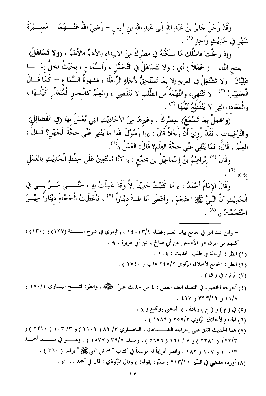 وَقَدْ رَحَلَ جَابرُ بنُ عَبْدِ اللهِ إِلَى عَبْدِ اللهِ بنِ أنِيسٍ - رَضِيَ اللهُ عَنْهُمَا - مَسِيْرَةَ شَهْرٍ في حَدِيْثٍ وَاحِدٍ (¬1).