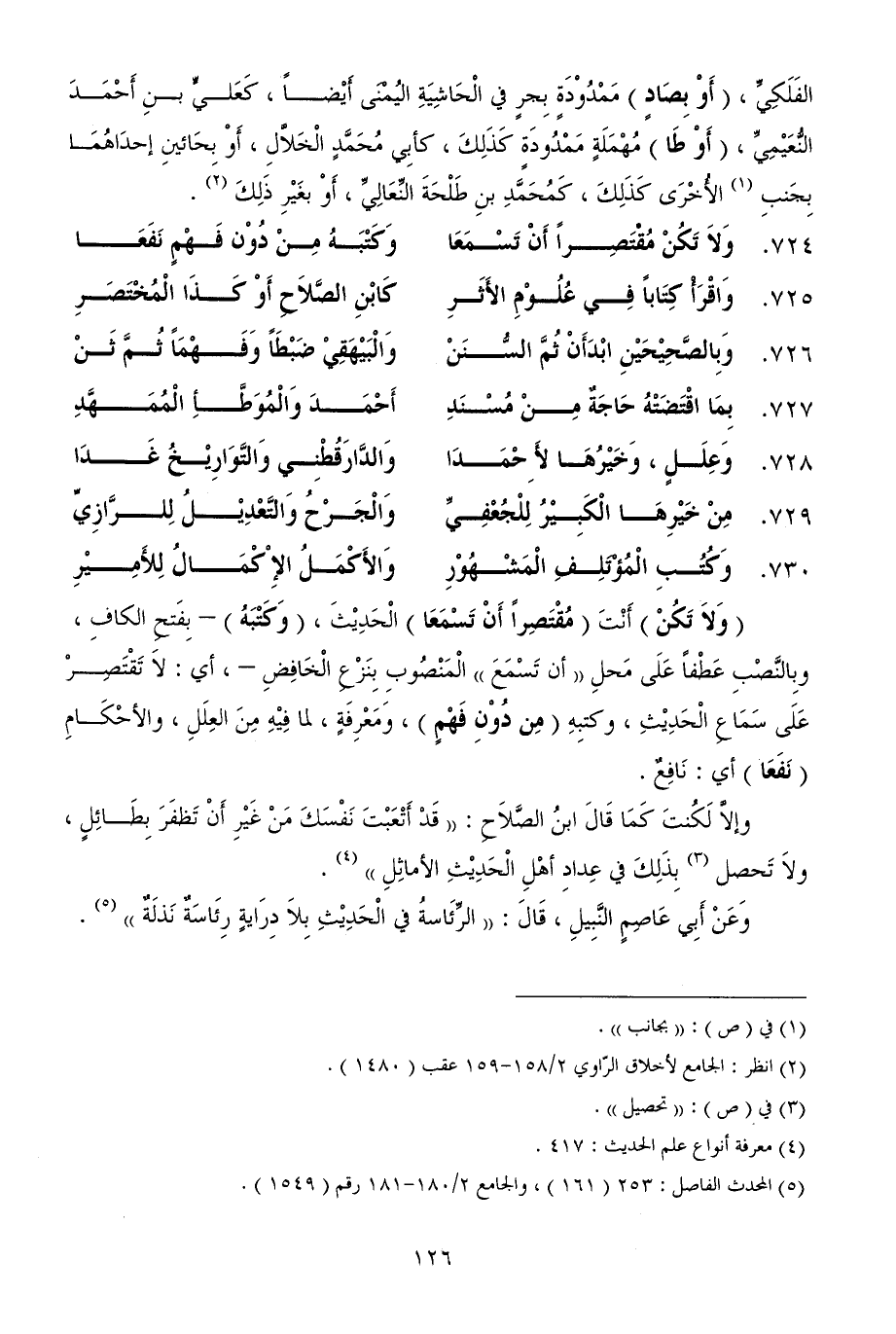 725 - وَاقْرَأْ كِتَاباً فِي عُلُوْمِ الأَثَرِ ... كَابْنِ الصَّلاَحِ أَوْ كَذَا الْمُخْتَصَرِ