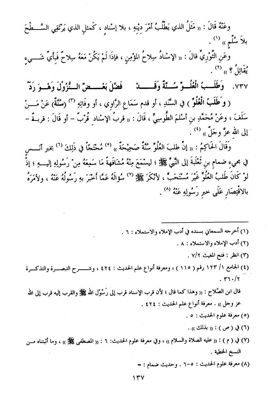 وَقَالَ الحَاكِمُ: ((إنَّ طلبَ العُلُوِّ سُنَّةٌ صَحِيْحَةٌ)) (¬5) مُحْتَجّاً في ذَلِكَ (¬6) بخبر أنَسٍ في مجيءِ ضمامِ بنِ ثَعْلَبةَ إلى النَّبيِّ - صلى الله عليه وسلم -؛ ليسْمَعَ مِنْهُ مُشَافَهةً مَا سَمِعَهُ مِنْ رَسُولِهِ إليهِ؛ إذْ لوْ كَانَ طَلبُ العُلُوِّ غَيْرَ مُسْتَحَبٍّ، لأنْكَرَ - صلى الله عليه وسلم - (¬7) سُؤالَهُ عَمَّا أَخْبَرَ بهِ رَسُولُهُ عَنْهُ، ولأمَرَهُ بالاقْتِصَارِ عَلَى خبرِ رَسُولِهِ عَنْهُ (¬8).