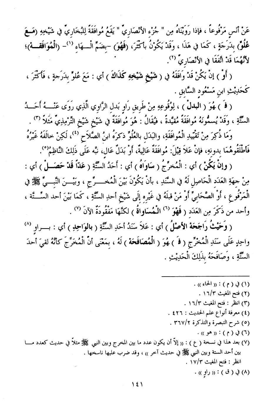 (¬7) بعد هذا في نسخة (ع): ((إلاّ أن يكون عدد ما بين المخرج وبين النبي - صلى الله عليه وسلم - مثلاً في حديث كعدد ما بين أحد الستة وبين النبي - صلى الله عليه وسلم - في حديث آخر))، وقد ضرب عليها ناسخها.