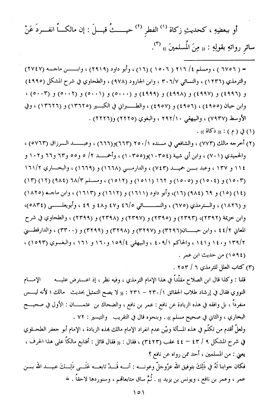 قلنا: وكذا قال ابن الصلاح مقلّداً في هذا الإمام الترمذي، وفيه نظر، إذ اعترض عليه ... الإمام النووي فقال في إرشاد طلاب الحقائق 1/ 230 - 231: ((لا يصح التمثيل بحديث مالك؛ لأنه ليس منفرداً، بل وافقه في هذه الزيادة عن نافع: عمر بن نافع، والضحاك بن عثمان: الأول في صحيح البخاري، والثاني في صحيح مسلم)). وبنحوه قال في التقريب والتيسير: 72.