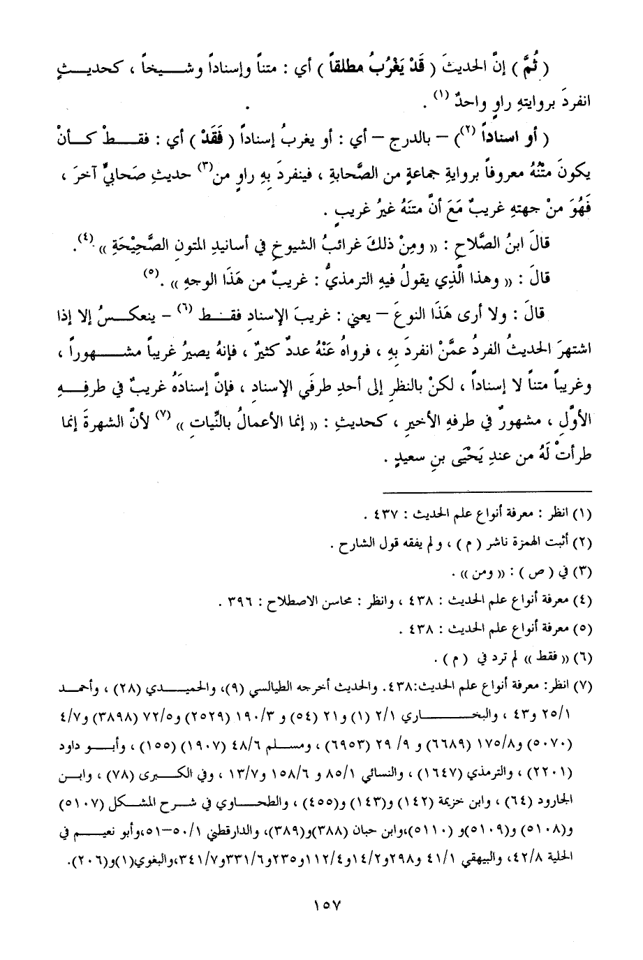 (¬7) انظر: معرفة أنواع علم الحديث: 438. والحديث أخرجه الطيالسي (9)، والحميدي (28)، وأحمد 1/ 25 و43، والبخاري 1/ 2 (1) و21 (54) و 3/ 190 (2529) و5/ 72 (3898) و7/ 4 (5070) و8/ 175 (6689) و 9/ 29 (6953)، ومسلم 6/ 48 (1907) (155)، وأبو داود (2201)، والترمذي (1647)، والنسائي 1/ 85 و 6/ 158 و7/ 13، وفي الكبرى (78)، وابن الجارود (64)، وابن خزيمة (142) و (143) و (455)، والطحاوي في شرح المشكل (5107) و (5108) و (5109) و (5110)، وابن حبان (388) و (389)، والدارقطني 1/ 50 - 51، وأبو نعيم في الحلية 8/ 42، والبيهقي 1/ 41 و298و2/ 14و4/ 112و235و6/ 331و7/ 341، والبغوي (1) و (206).