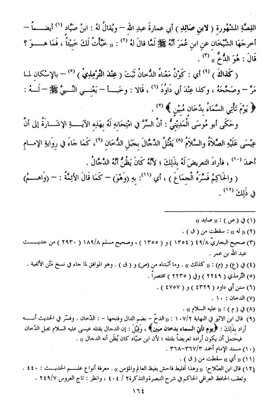 (¬9) قال ابن الاثير في النهاية 2/ 107: ((الدخّ - بضم الدال وفتحها -: الدّخان. وفسّر في الحديث أنه أراد بِذَلِكَ: {يوم تأتي السماء بدخان مبين}، وَقِيْلَ: إن الدجال يقتله عيسى عليه السلام بجبل الدّخان. فيحتمل أن يكون أراده تعريضاً بقتله؛ لأن ابن صيّاد كان يُظَن أنه الدجال)).