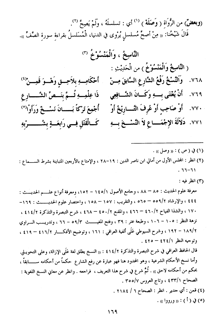 770 - أَوْ صَاحِبٍ أَوْ عُرِفَ التَّارِيْخُ أَوْ ... أُجْمِعَ تَرْكاً بَانَ نَسْخٌ وَرَأَوْا (¬5)