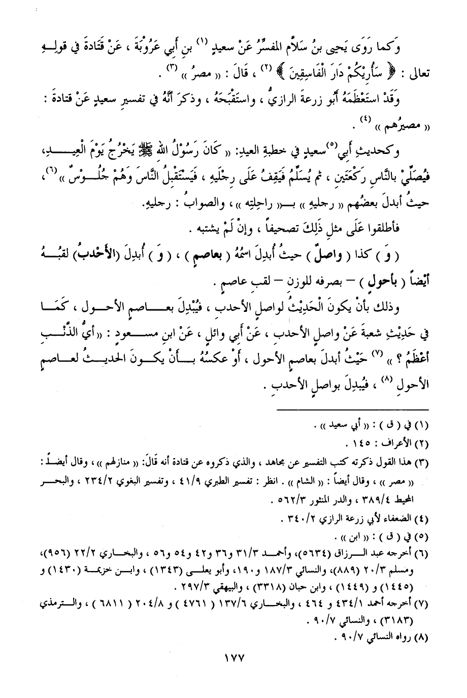 وَكما رَوَى يَحيى بنُ سَلاَّم المفسِّرُ عَنْ سعيدٍ (¬1) بنِ أَبِي عَرُوْبَةَ، عَنْ قَتَادةَ في قولِهِ تعالى: {سَأُرِيْكُمْ دَارَ الْفَاسِقِينَ} (¬2)، قَالَ: ((مصرُ)) (¬3).