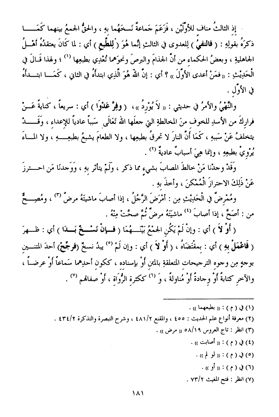 إِذِ الثالثُ منافٍ للأوَّلَيْن، فَزَعَمَ جَماعةٌ نَسخَهُما بِهِ، والحقُّ الجمعُ بينهما كَمَا ذكرَهُ بقولِهِ: (فالنفيُ) لِلعدوى في الثالثِ إنَّما هُوَ (لِلطَّبعِ) أي: لما كَانَ يعتقدُهُ أهْلُ الجاهليةِ، وبعضُ الحكماءِ من أنَّ الجذامَ والبرصَ ونحوَهما تُعْدِي بطبعِها (¬1)؛ ولهذا قَالَ في الْحَدِيْثِ: ((فمَنْ أعدى الأوَّلَ))؟ أي: إنَّ اللهَ هُوَ الَّذِي ابتدأَهُ في الثاني، كَمَا ابتدأَهُ في الأوَّلِ.