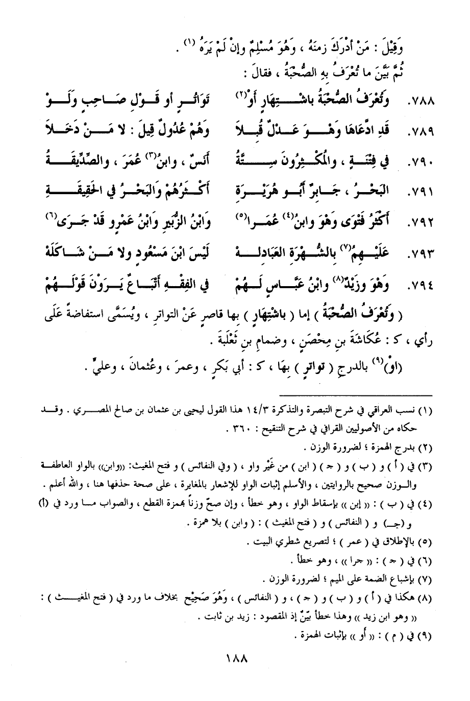(¬3) في (أ) و (ب) و (ج) (ابن) من غَيْر واو، (وفي النفائس) وفتح المغيث: ((وابن)) بالواو العاطفة، والوزن صحيح بالروايتين، والأسلم إثبات الواو للإشعار بالمغايرة، على صحة حذفها هنا، والله أعلم.