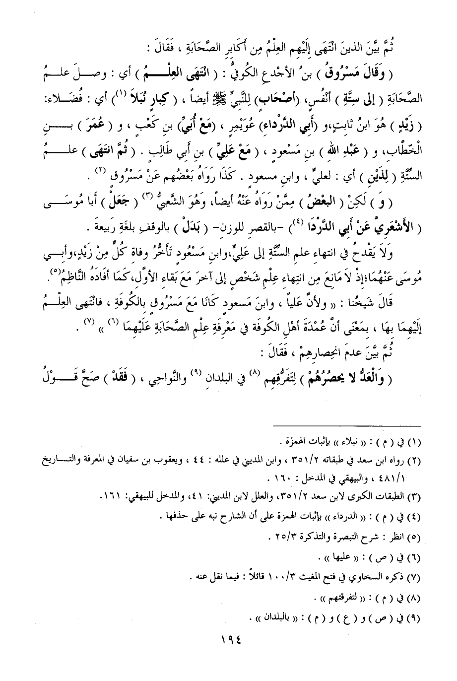 قَالَ شَيخُنا: ((ولأنَّ عَلياً، وابنَ مَسعودٍ كَانَا مَعَ مَسْرُوقٍ بِالكُوفَةِ، فانْتَهى العِلْمُ إلَيْهِمَا بِهَا، بِمَعْنَى أنَّ عُمْدَةَ أهْلِ الكُوفَة في مَعْرِفَةِ عِلْمِ الصَّحَابَةِ عَلَيْهِمَا (¬6))) (¬7).