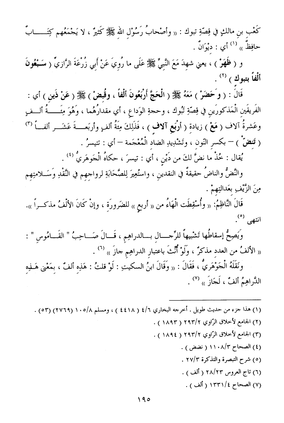 وَيَصِحُّ إسقاطُها تَشْبيهاً للرِّجالِ بالدراهِمِ، قَالَ صَاحِبُ " القَامُوسِ ": ((الألفُ من العددِ مذكرٌ، وَلَوْ أُنِّثَ باعتبارِ الدراهِمِ جازَ)) (¬6).