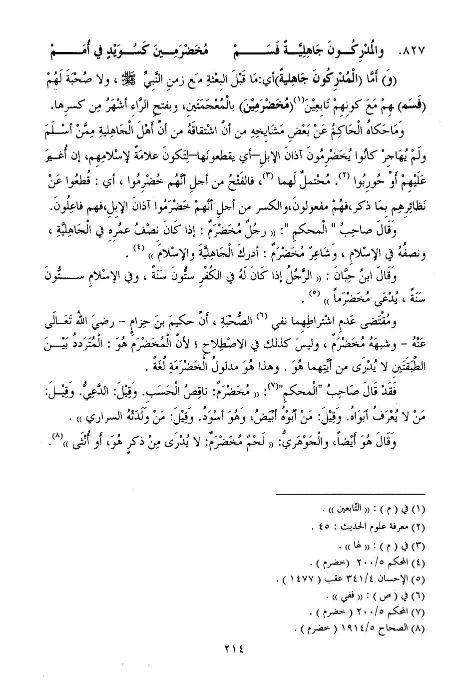 827 - والمُدْرِكُونَ جَاهِلِيَّةً فَسَمْ ... مُخَضْرَمِينَ كَسُوَيْدٍ في أُمَمْ