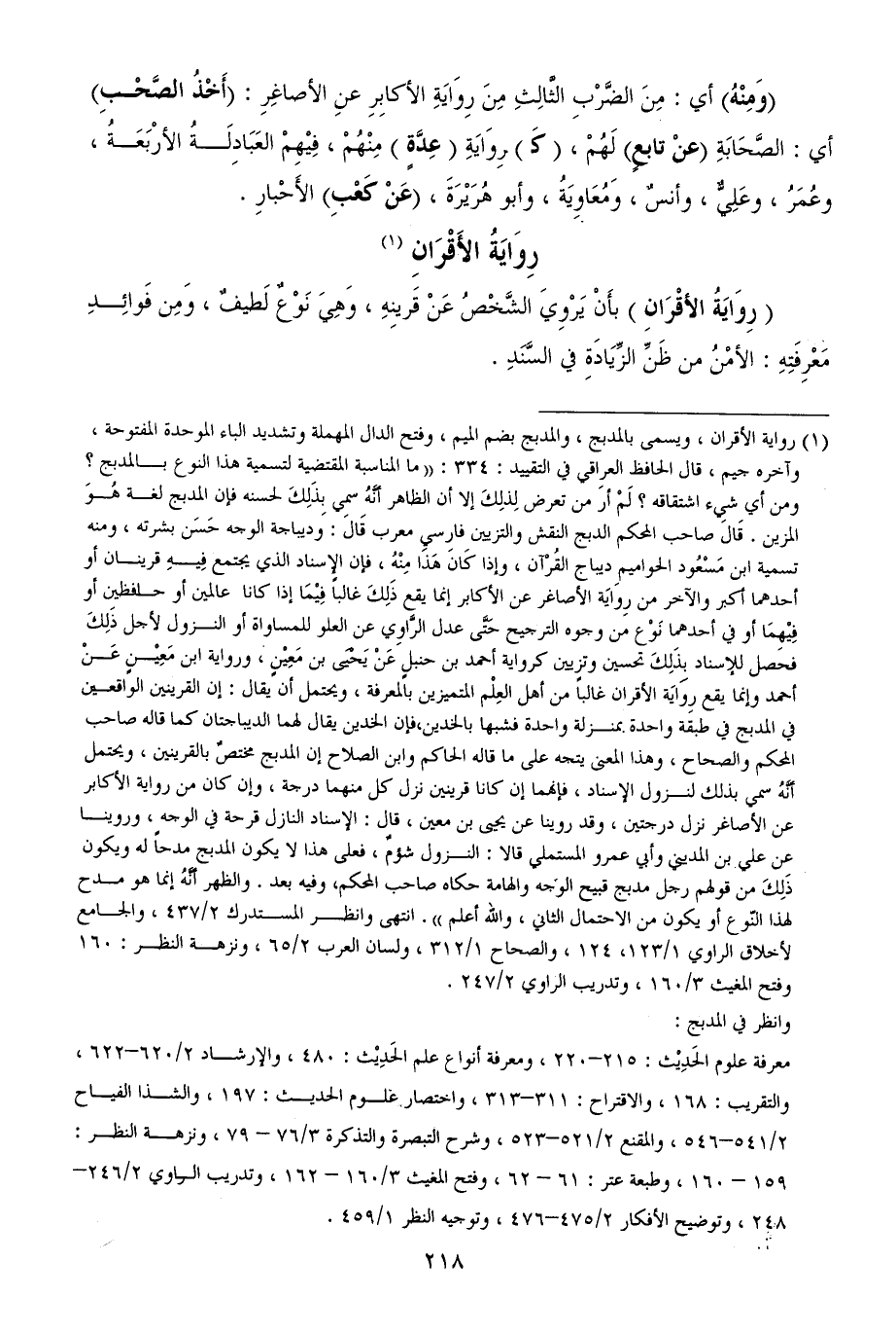 (¬1) رواية الأقران، ويسمى بالمدبج، والمدبج بضم الميم، وفتح الدال المهملة وتشديد الباء الموحدة المفتوحة، وآخره جيم، قال الحافظ العراقي في التقييد: 334: ((ما المناسبة المقتضية لتسمية هذا النوع بالمدبج؟ ومن أي شيء اشتقاقه؟ لَمْ أرَ من تعرض لِذلِكَ إلا أن الظاهر أنَّهُ سمي بِذَلِكَ لحسنه فإن المدبج لغة هُوَ المزين. قَالَ صاحب المحكم الدبج النقش والتزيين فارسي معرب قَالَ: وديباجة الوجه حَسَن بشرته، ومنه تسمية ابن مَسْعُود الحواميم ديباج القُرْآن، وإذا كَانَ هَذَا مِنْهُ، فإن الإسناد الذي يجتمع فِيهِ قرينان أو أحدهما أكبر والآخر من رِوَايَة الأصاغر عن الأكابر إنما يقع ذَلِكَ غالباً فِيْمَا إذا كانا عالمين أو حافظين أو فِيْهِمَا أو في أحدهما نَوْع من وجوه الترجيح حَتَّى عدل الرَّاوِي عن العلو للمساواة أو النزول لأجل ذَلِكَ فحصل للإسناد بِذَلِكَ تحسين وتزيين كرواية أحمد بن حنبلٍ عَنْ يَحْيَى بن مَعِيْنٍ، ورواية ابن مَعِيْنٍ عَنْ أحمد وإنما يقع رِوَايَة الأقران غالباً من أهل العِلْم المتميزين بالمعرفة، ويحتمل أن يقال: إن القرينين الواقعين في المدبج في طبقة واحدة بمنزلة واحدة فشبها بالخدين، فإن الخدين يقال لهما الديباجتان كما قاله صاحب المحكم والصحاح، وهذا المعنى يتجه على ما قاله الحاكم وابن الصلاح إن المدبج مختصٌ بالقرينين، ويحتمل أنَّهُ سمي بذلك لنزول الإسناد، فإنهما إن كانا قرينين نزل كل منهما درجة، وإن كان من رواية الأكابر عن الأصاغر نزل درجتين، وقد روينا عن يحيى بن معين، قال: الإسناد النازل قرحة في الوجه، وروينا عن علي بن المديني وأبي عمرو المستملي قالا: النزول شؤمٌ، فعلى هذا لا يكون المدبج مدحاً له ويكون ذَلِكَ من قولهم رجل مدبج قبيح الوجه والهامة حكاه صاحب المحكم، وفيه بعد. والظهر أنَّهُ إنما هو مدح لهذا النّوع أو يكون من الاحتمال الثاني، والله أعلم)). انتهى وانظر المستدرك 2/ 437، والجامع لأخلاق الراوي 1/ 123، 124، والصحاح 1/ 312، ولسان العرب 2/ 65، ونزهة النظر: 160 وفتح المغيث 3/ 160، وتدريب الراوي 2/ 247.