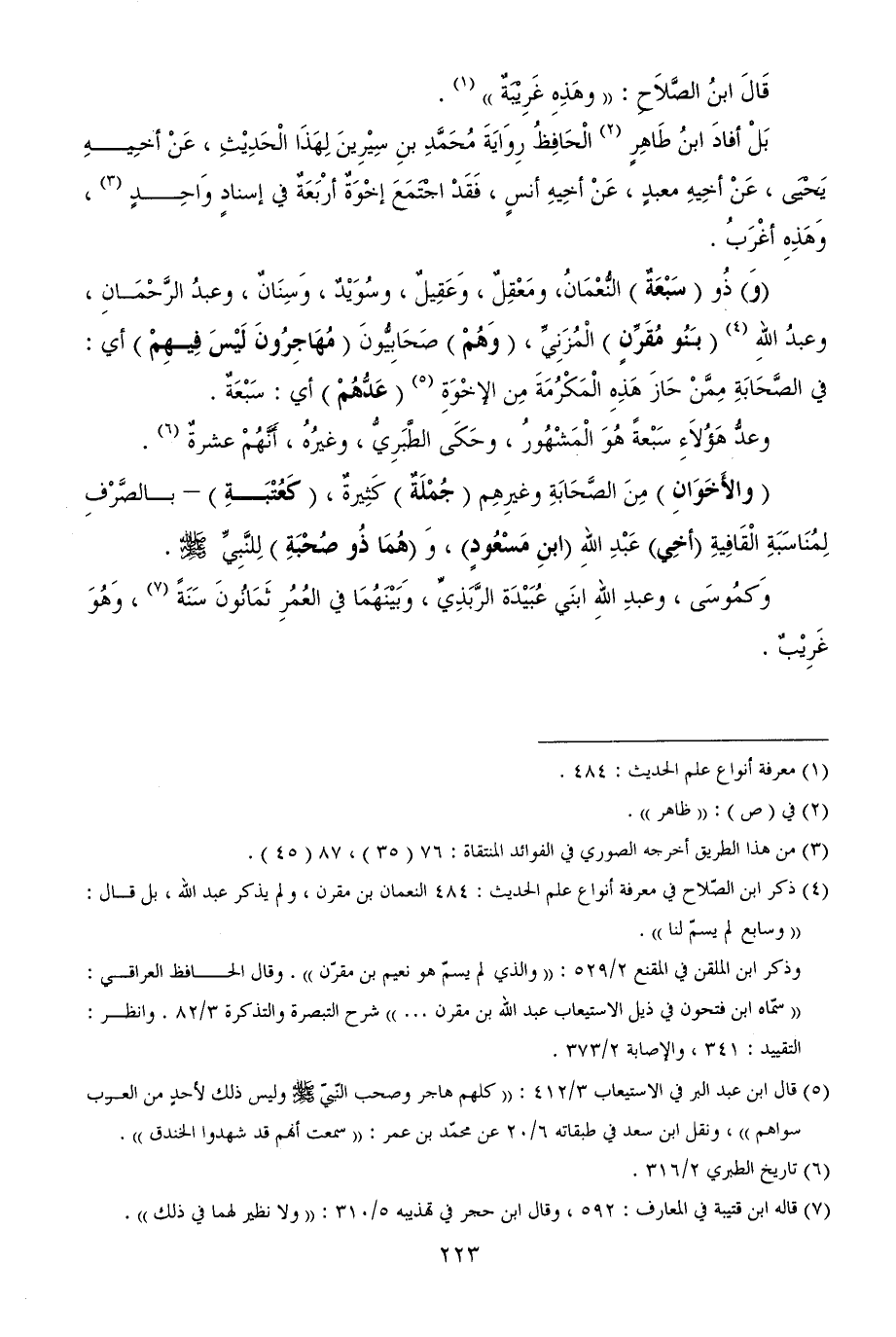 (¬4) ذكر ابن الصّلاح في معرفة أنواع علم الحديث: 484 النعمان بن مقرن، ولم يذكر عبد الله، بل قال: ((وسابع لم يسمّ لنا)).