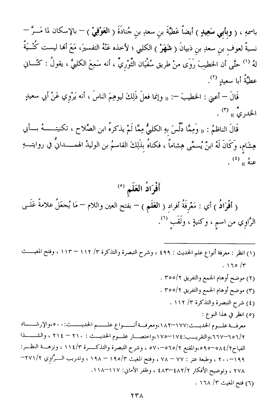(أفْرَادُ) أي: مَعْرِفَةُ أفرادِ (العَلَمِ) - بفتح العين واللام - مَا يُجعَلُ علامةً عَلَى الرَّاوِي من اسمٍ، وكنيةٍ، ولَقَبٍ (¬6).