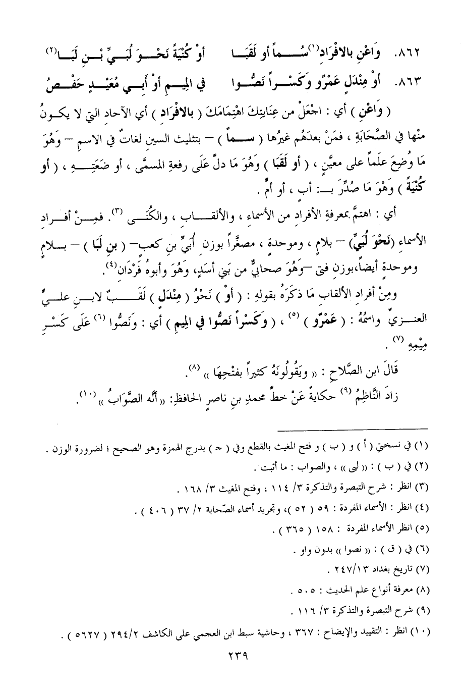 (وَاعْنِ) أي: اجْعَلْ من عِنَايتِكَ اهْتِمَامَكَ (بالافْرَادِ) أي الآحادِ التي لا يكونُ منْها في الصَّحَابَةِ، فمَنْ بعدَهُم غيرُها (سماً) - بتثليث السينِ لغاتٌ في الاسمِ - وَهُوَ مَا وُضِعَ علَماً على معيَّنٍ، (أو لَقَبَا) وَهُوَ مَا دلَّ عَلَى رفعةِ المسمَّى، أو ضَعَتِهِ، (أو كُنْيَةً) وَهْوَ مَا صُدِّرَ بـ: أبٍ، أو أمٍّ.